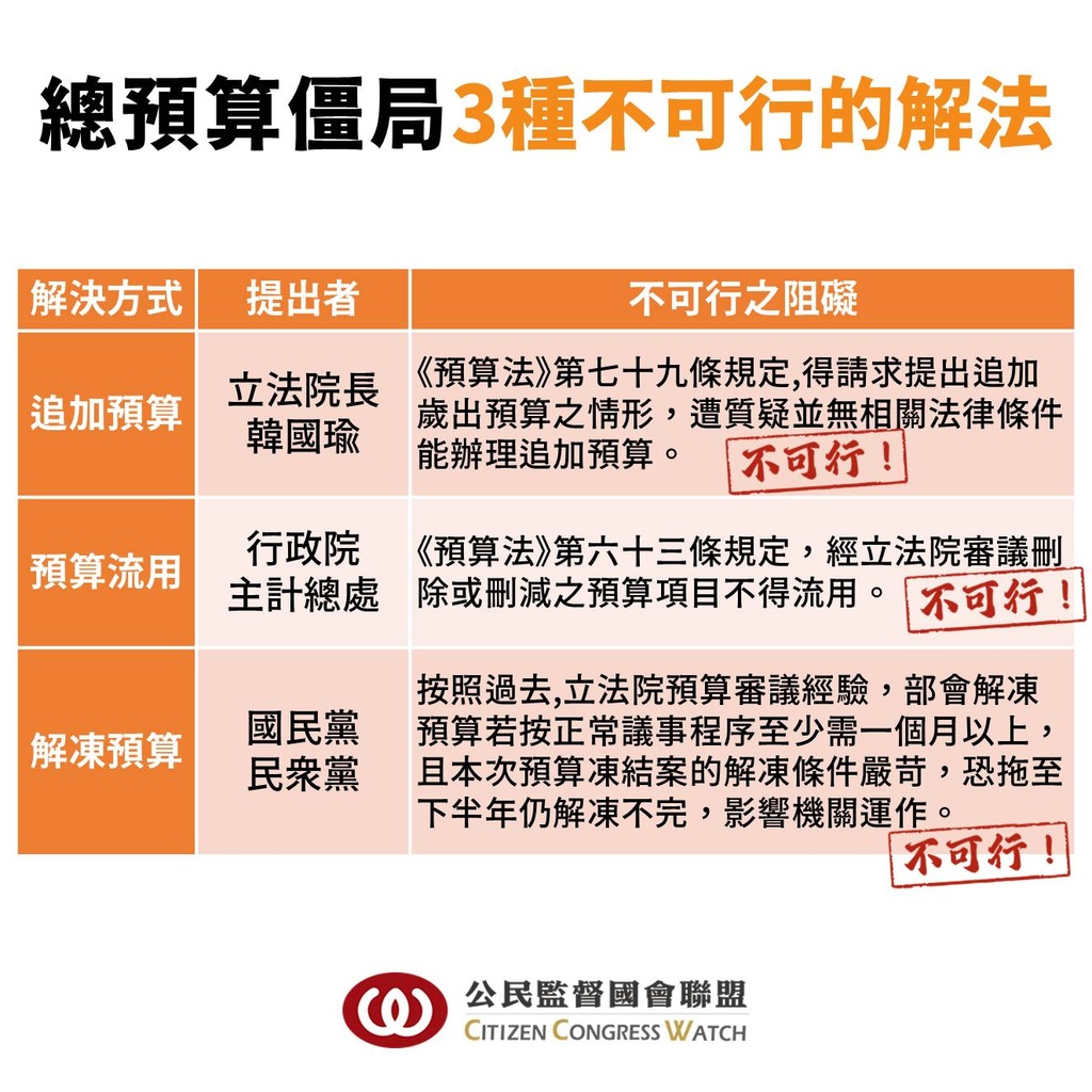 在野黨多次強調追加預算、解凍預算就可以解決總預算之亂,但是,實務上面對特定機關預算被大量刪減、凍結的情況下,都緩不濟急,並有違法之虞!前者,並不符合《預算法》第七十九條辦理追加預算的條件;後者,按照過去,立法院預算審議經驗,各部會最後一筆預算經常拖至年底才解凍,更不用提外交國防委員會連民國106年的解凍案都還尚未處理,再加上本次凍結案的解凍條件嚴苛,能預見立法院本會期將沒有足夠的時間處理其他重要的民生法案,屆時若上百案凍結案還是無法在三、四月順利解凍,恐將使多項公共政策被迫停擺,嚴重影響民眾權益!