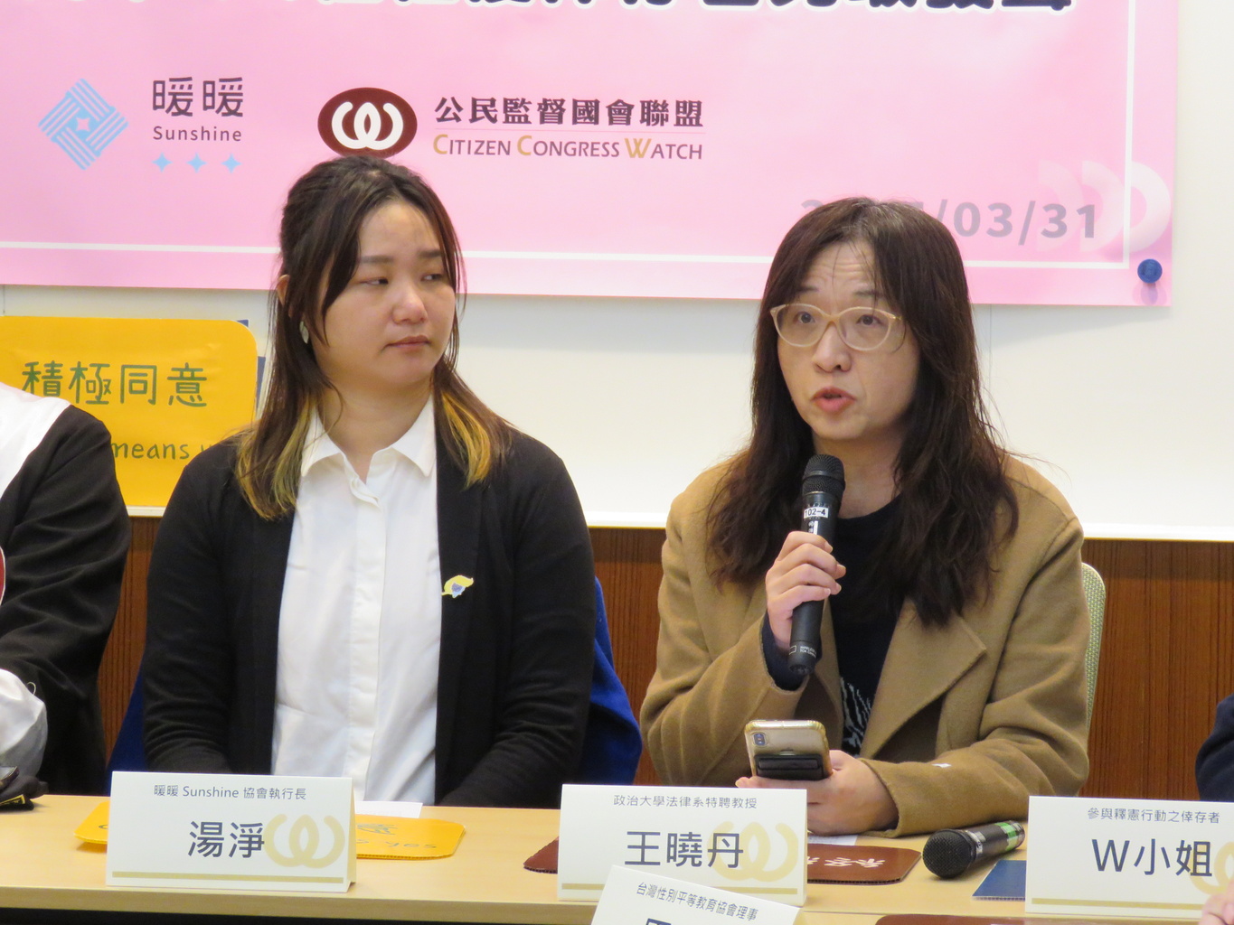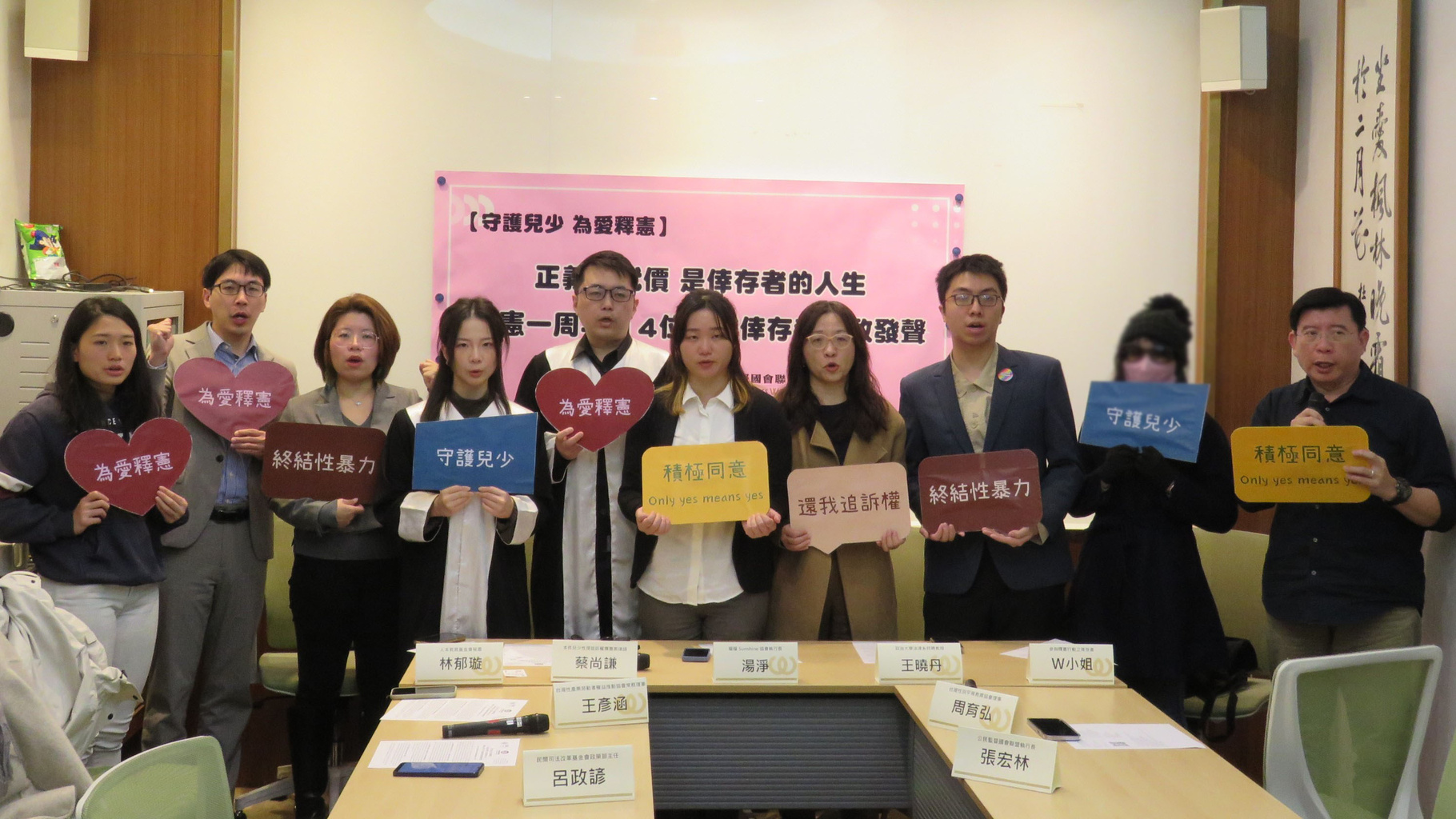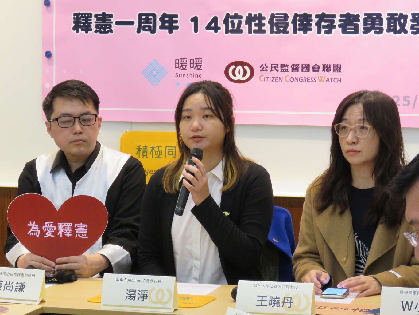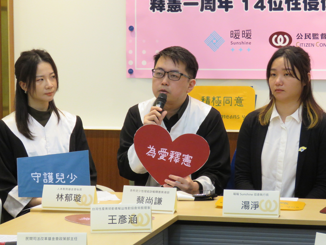 出席名單: 湯 淨 (暖暖Sunshine協會執行長) W小姐 (參與釋憲行動之倖存者) 蔡尚謙 (本件兒少性侵追訴權釋憲案律師) 王曉丹 (政治大學法律系特聘教授) 林郁璇 (人本教育基金會秘書) 呂政諺 (民間司法改革基金會政策部主任) 王彥涵 (台灣性產業勞動者權益推動協會常務理事) 周育弘 (台灣性別平等教育協會理事) 張宏林(公民監督國會聯盟執行長) 李毓倫 (公益律師團律師)