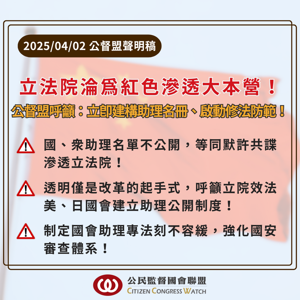 【聲明稿】立法院淪為紅色滲透大本營! 公督盟呼籲:立即建構助理名冊、啟動修法防範!