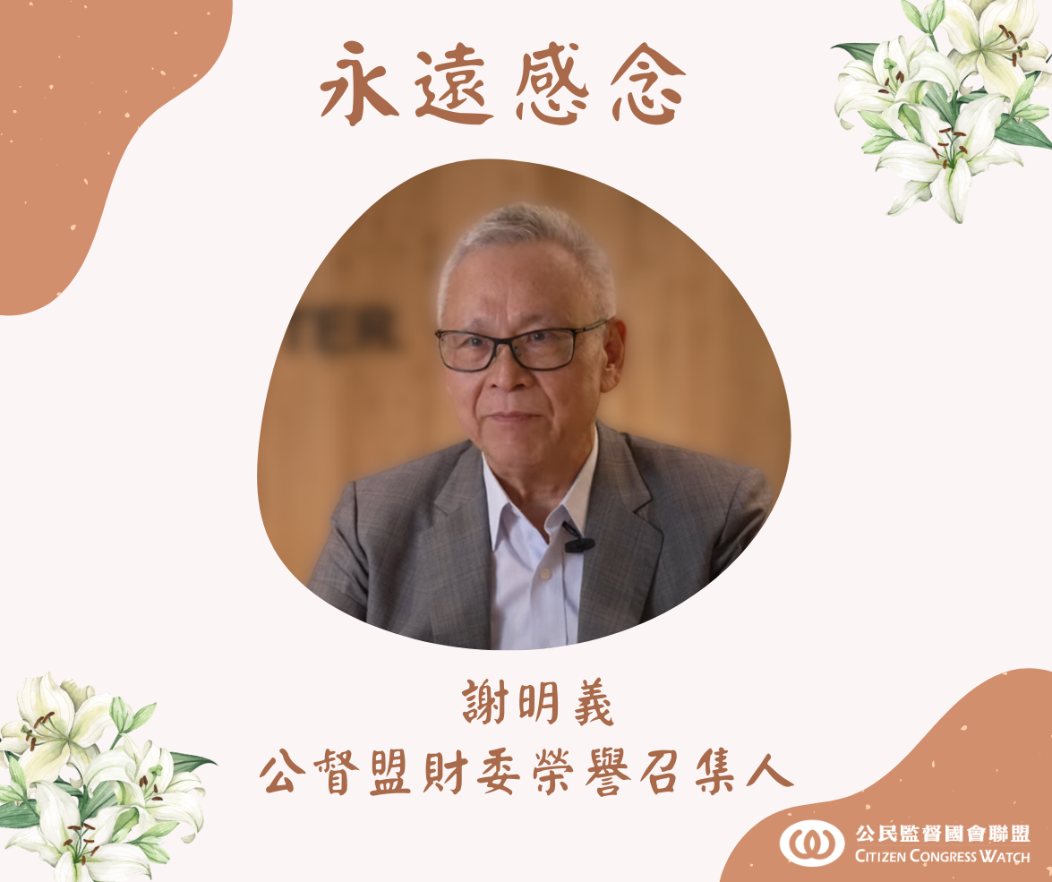 我們敬愛的財委榮譽召集人謝明義先生,於3月1日與世長辭,公督盟全體理監事、財務委員與同仁致上最深哀悼之意,並同時感謝其在世時對公督盟之國會監督任務長期給予大力支持,為台灣的民主深化奠定深厚基礎。