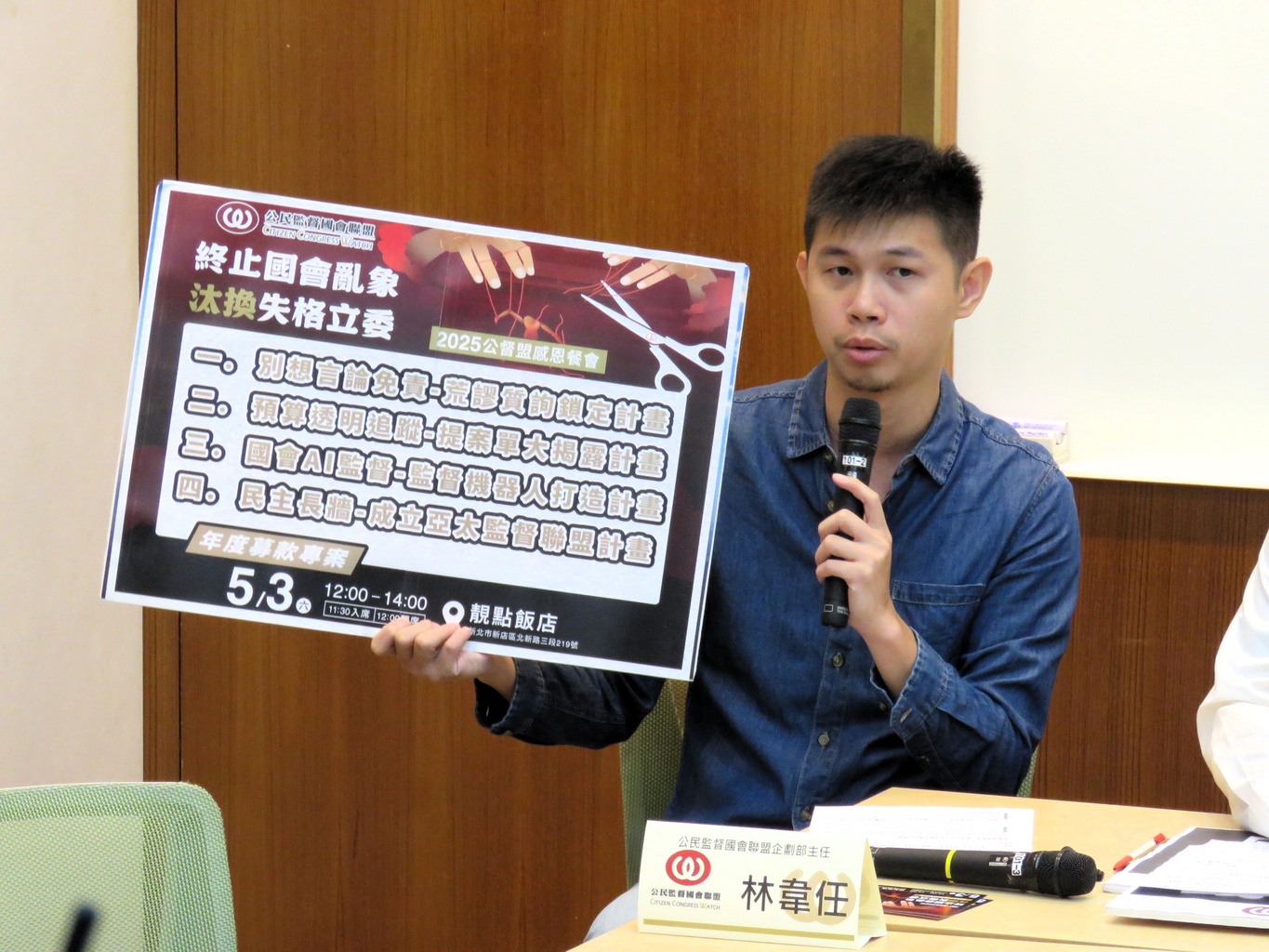 公督盟企劃部主任林韋任表示:「面對立法院過去一年多來的衝突加劇、國安法案遭惡意封殺、 預算審議機制崩壞,再加上公然踐踏民主議事程序…等種種亂象,台灣社會正在承受立法權失控 的深層代價。2025年,公督盟同步啟動四項年度募款監督計畫,期望強化國會民主韌性,包括: