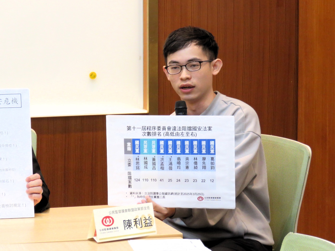 公督盟政策部主任陳利益強調:「本屆國會三讀立法效率不佳,連帶影響許多重要國安法案的進 展,在這個情況之下,部分國安法案甚至連進到委員會討論都沒辦法,立法院多數的國、眾兩黨 將『 形式審查』的程序委員會作為惡意政治操作的場所,多次違反《立法院程序委員會組織規程》 的規定將其不順眼的法案『暫緩列案』,導致多名立委所提立委赴中納管、申報之提案,無法成 為正式的立院紀錄,簡直是惡意沒收其他民意代表的提案權!」