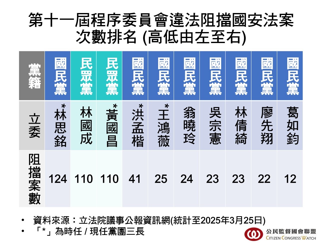 回顧過去兩屆立法院幾乎沒有惡意擋案的案例,不過本屆立法院卻做出最壞示範,破壞民主議事 程序,將程序委員會作為太上委員會,進行『實質審查』,公督盟統計本屆立法院至今年三月底, 程序委員會所有提案紀錄,針對《臺灣地區與大陸地區人民關係條例第九條及第九十一條修正草 案》(立委赴中規範),違法重複擋案總共282件,其中,國民黨立委林思銘擔任黨團幹部,一共 擋了124件國安法案,位居「立法院國安擋案王」,公督盟呼籲國民黨、民眾黨團停止程序封殺, 盡速讓國安法案進入實質審查,否則人民將會淘汰反國安立委!」
