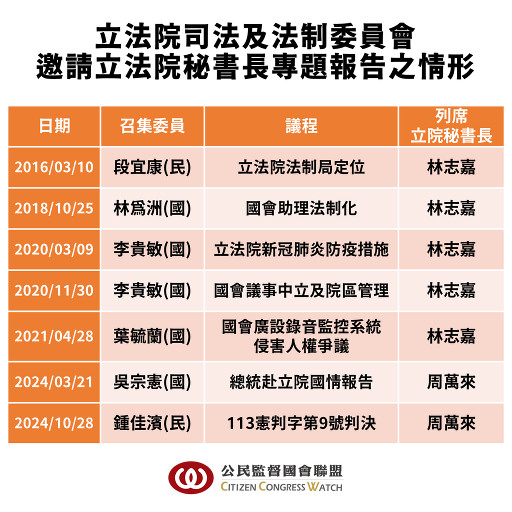 但是在韓國瑜院長所主導的立法院卻發出的新聞稿,強調幕僚人員非立委行使立法權的監督客體,對於議事空間不足、資訊安全防護薄弱,和國會機密資料防護機制老舊……等問題,拒絕向全民報告,根據過去立法院議事公報紀錄,過去司法法制委員會不分黨派,藍、綠召委都有邀請過立法院秘書長進行專題報告的前例,不管是前立院秘書長林志嘉,又或者現任秘書長周萬來都有到立院進行專案報告的紀錄,公督盟強調站在公益角度,呼籲立法院秘書長周萬來在本週剩餘議程應配合委員會備詢,並代表立法院長韓國瑜來向全民一同報告國會重大議題處理進度,而非帶頭藐視人民,惡意逃避人民監督!