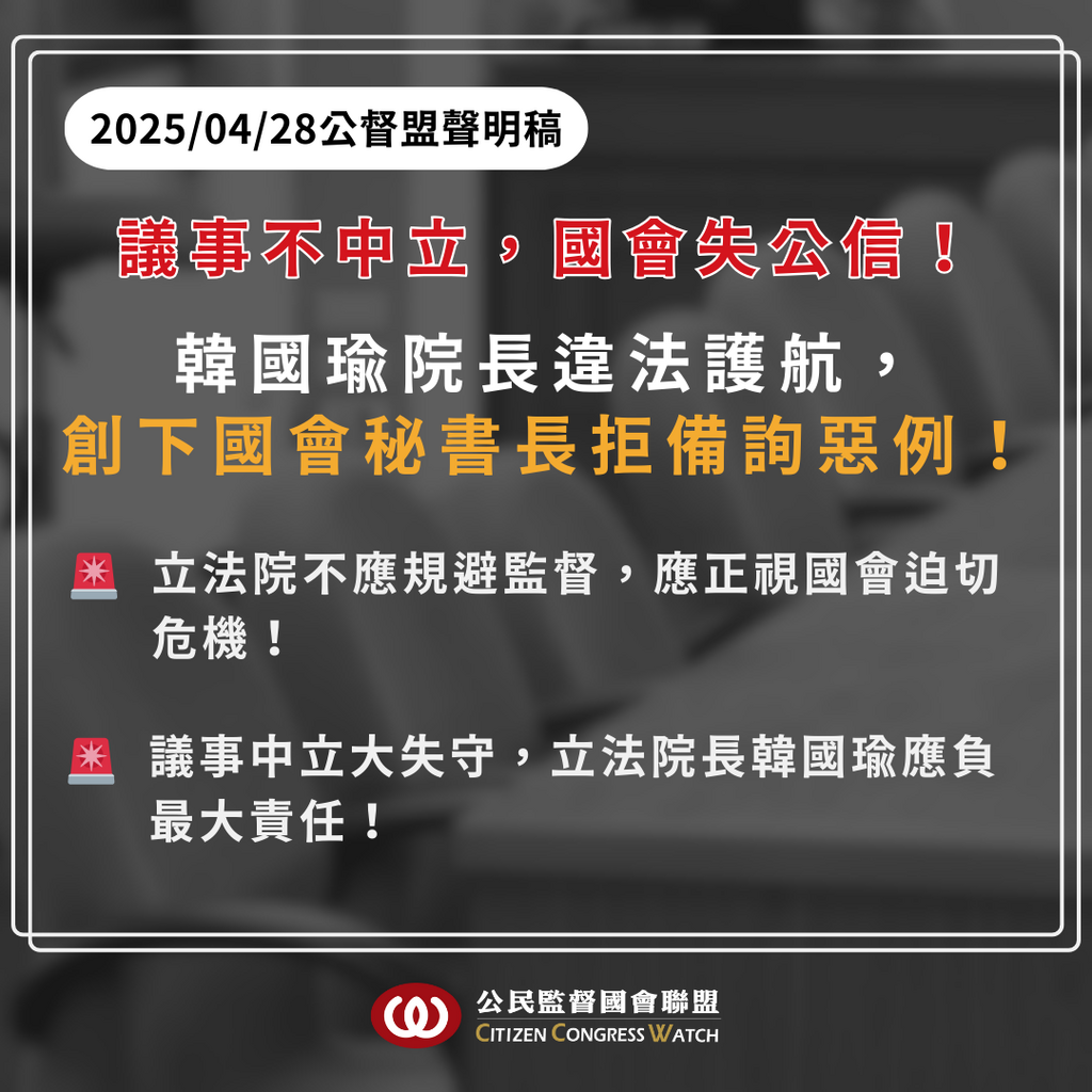 【聲明稿】議事不中立,國會失公信!韓院長違法護航,創下國會秘書長拒備詢惡例!
