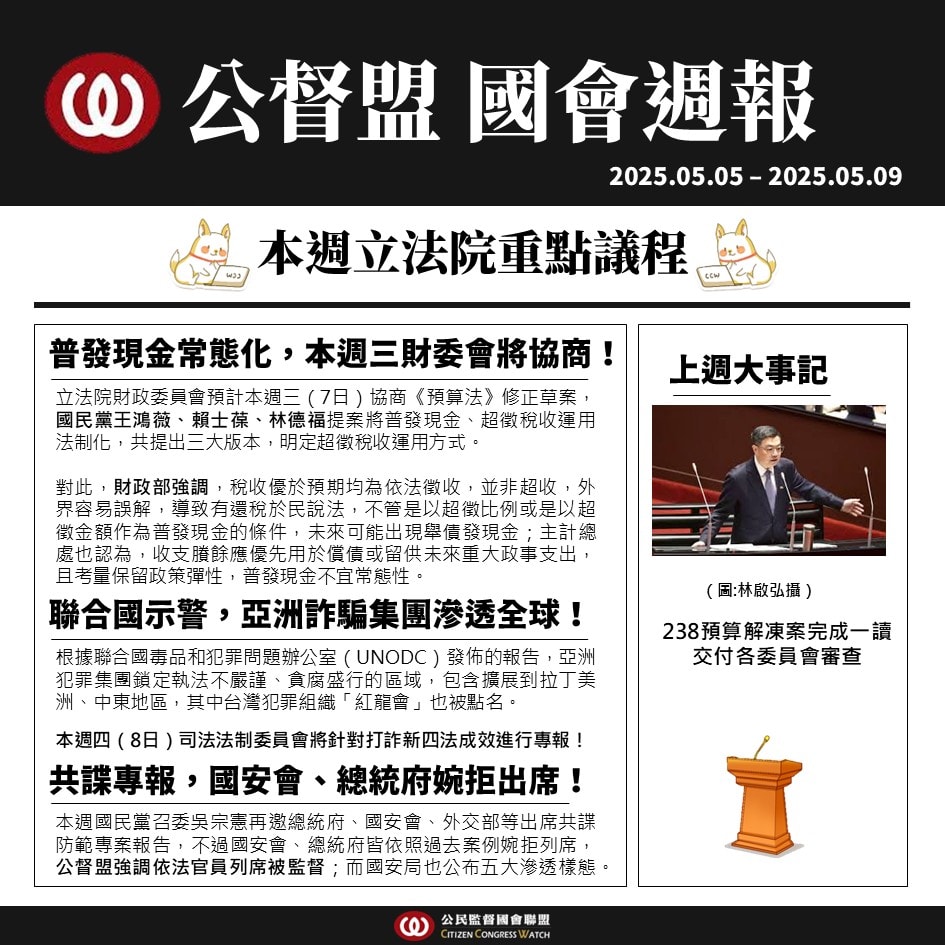 🔎238預算解凍案上周五完成一讀公督盟呼籲各委員會召委應盡速排審!