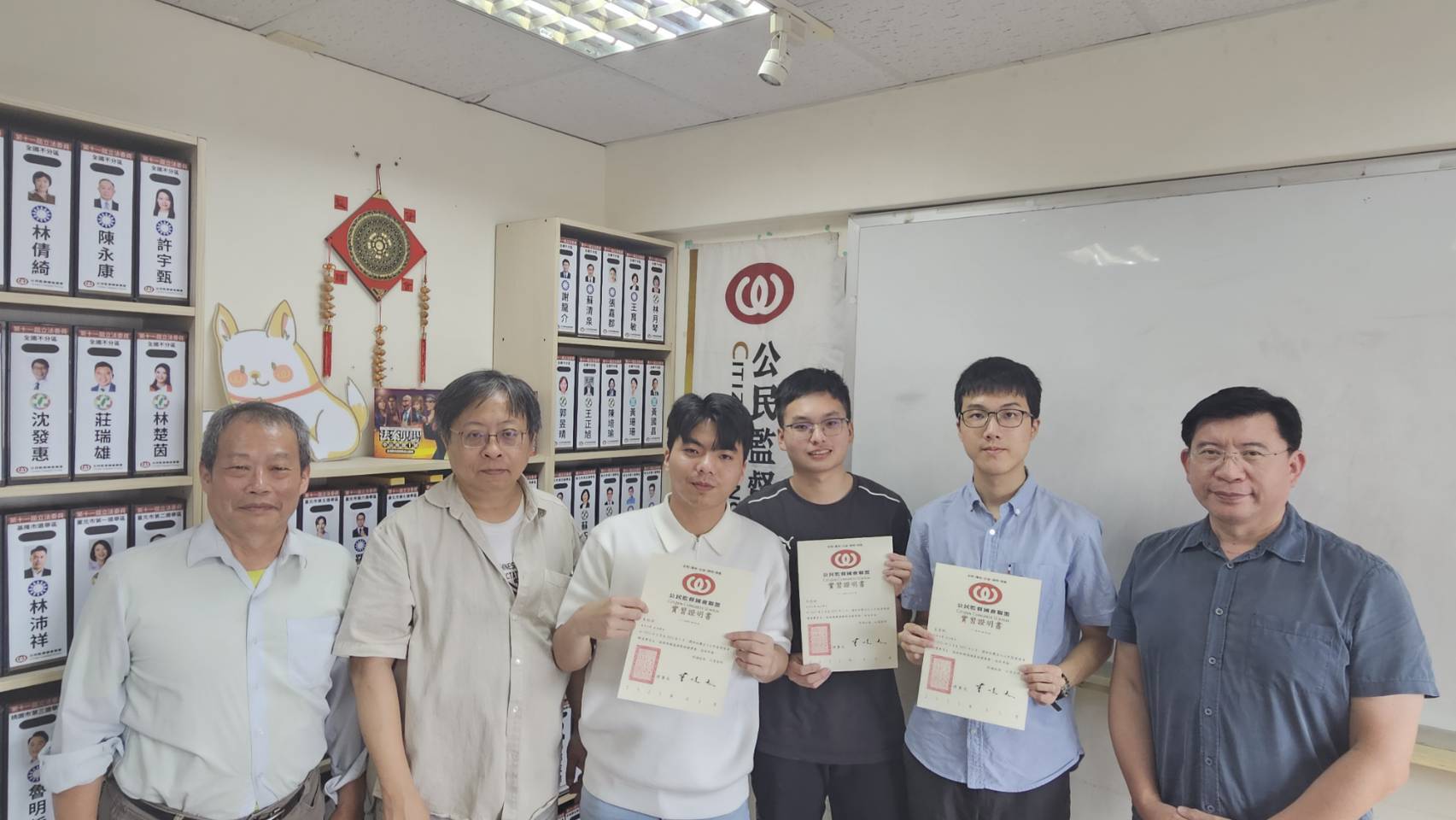 (由左至右為公督盟常務監事謝東儒、理事長曾建元、實習生朱柏丞、紀臣祐、易韋帆、執行長張宏林)