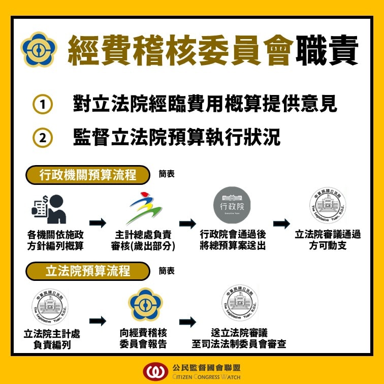 簡單來說,立法院的預算是立法院會計幕僚單位編製,向經費稽核委員會報告後,送立法院審議。