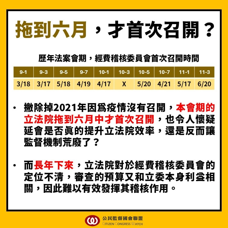 而且按照《經費稽核委員會組織章程》規定,委員會應該是每個月都要定期召開會議,撇除掉2021年因為疫情上半年會期沒有召開,每年大多在三、四月就會先開會選出召集委員,而本會期立法院則拖到六月中才第一次召開,也令人懷疑延會是否真的提升立法院效率,還是反而讓監督機制荒廢了?