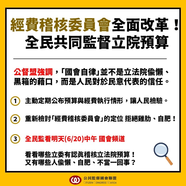 ​公督盟強調,「國會自律」不是立法院偷懶、黑箱的藉口,而是人民對於民意代表的信任,立法院應該主動定期上網公布預算與經費執行情形,讓人民檢驗、向全民負責!