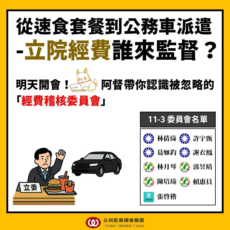 你可能有印象,在國會頻道中有立委在會議上抱怨立院餐費「不夠買速食套餐」,也有立委質疑立法院公務車派車需求不夠──事實上,這些畫面都發生在立法院的「經費稽核委員會」當中。