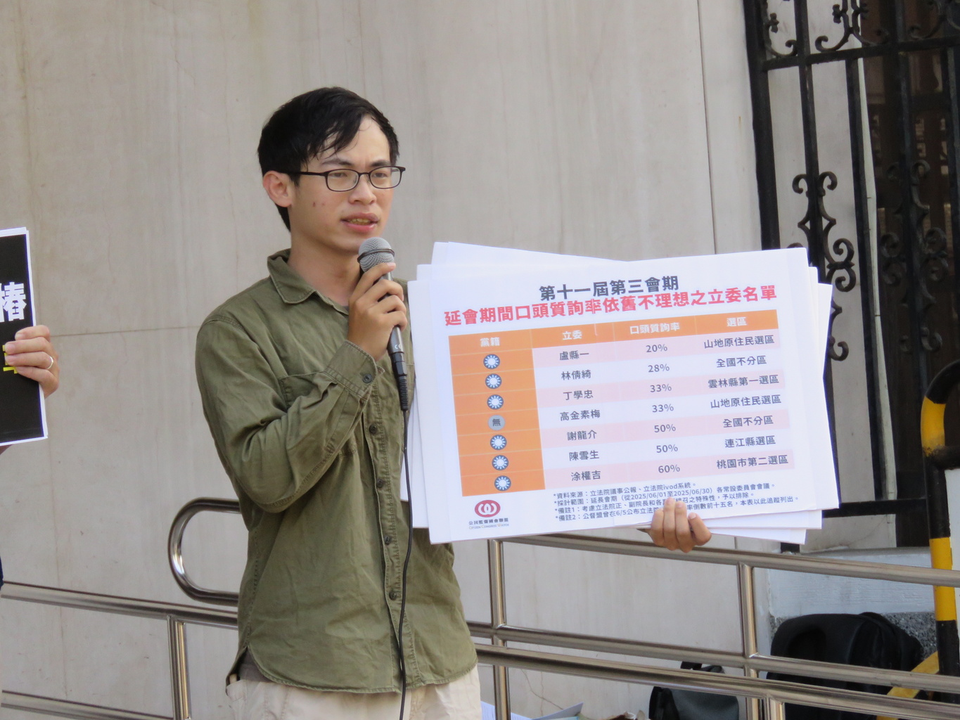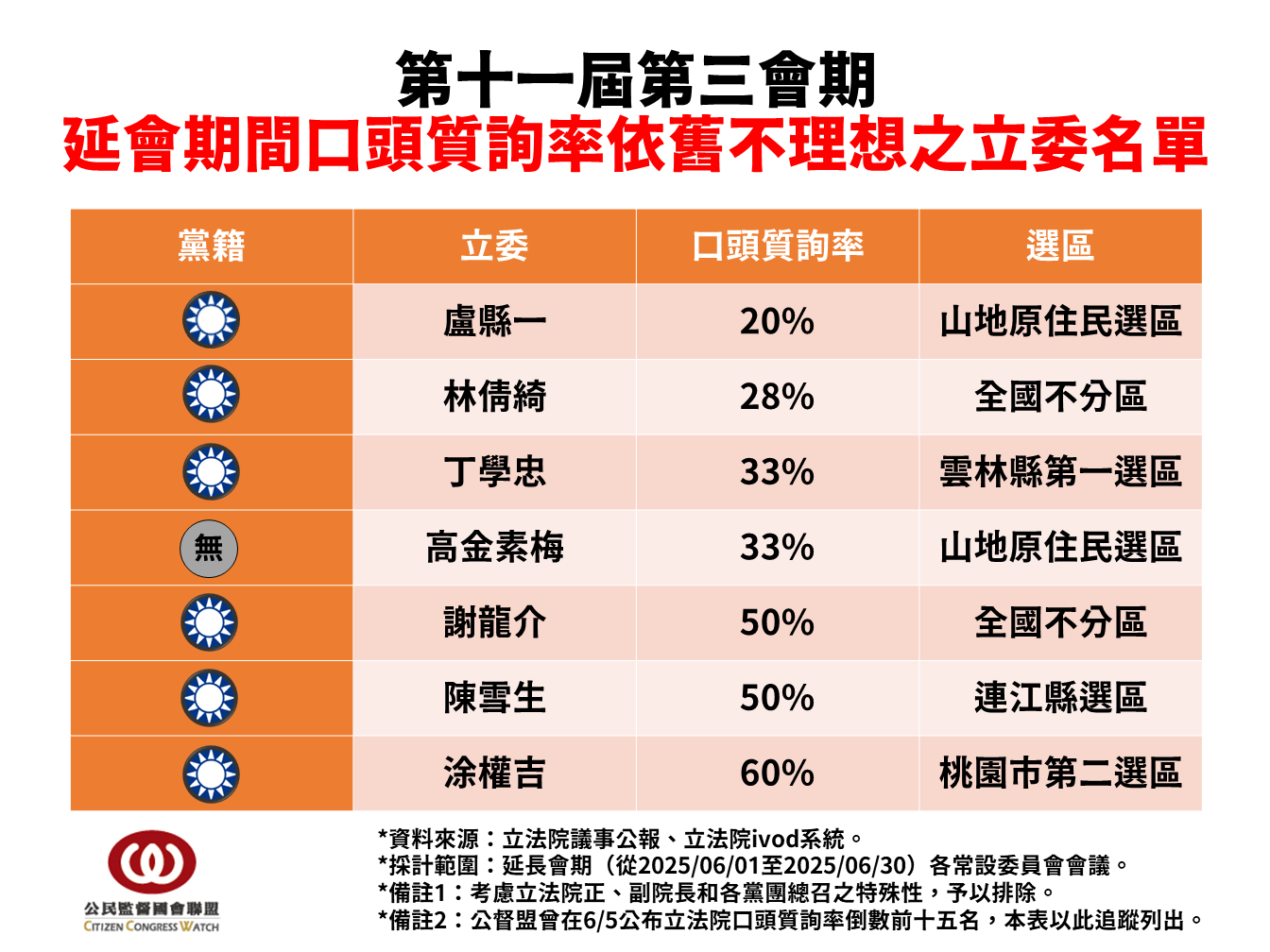 公督盟常務監事林美娜表示,上個月公督盟才公布,在法定會期(五月底前),立法院委員會口頭質詢率倒數前十五名,幾乎都是國民黨立委,沒想到被民間團體點名後,在延會第一個月,仍然有七位立委的口頭質詢率不到60%,分別是盧縣一、林倩綺、丁學忠、高金素梅、謝龍介、陳雪生、涂權吉,其中更不乏一些即將面對罷免的立法委員,而這些立法委員都投票同意延會卻不去開會,公督盟強調這些立法委員在國會問政表現,自然會被人民看在眼裡,負起民主社會下應當的政治責任!