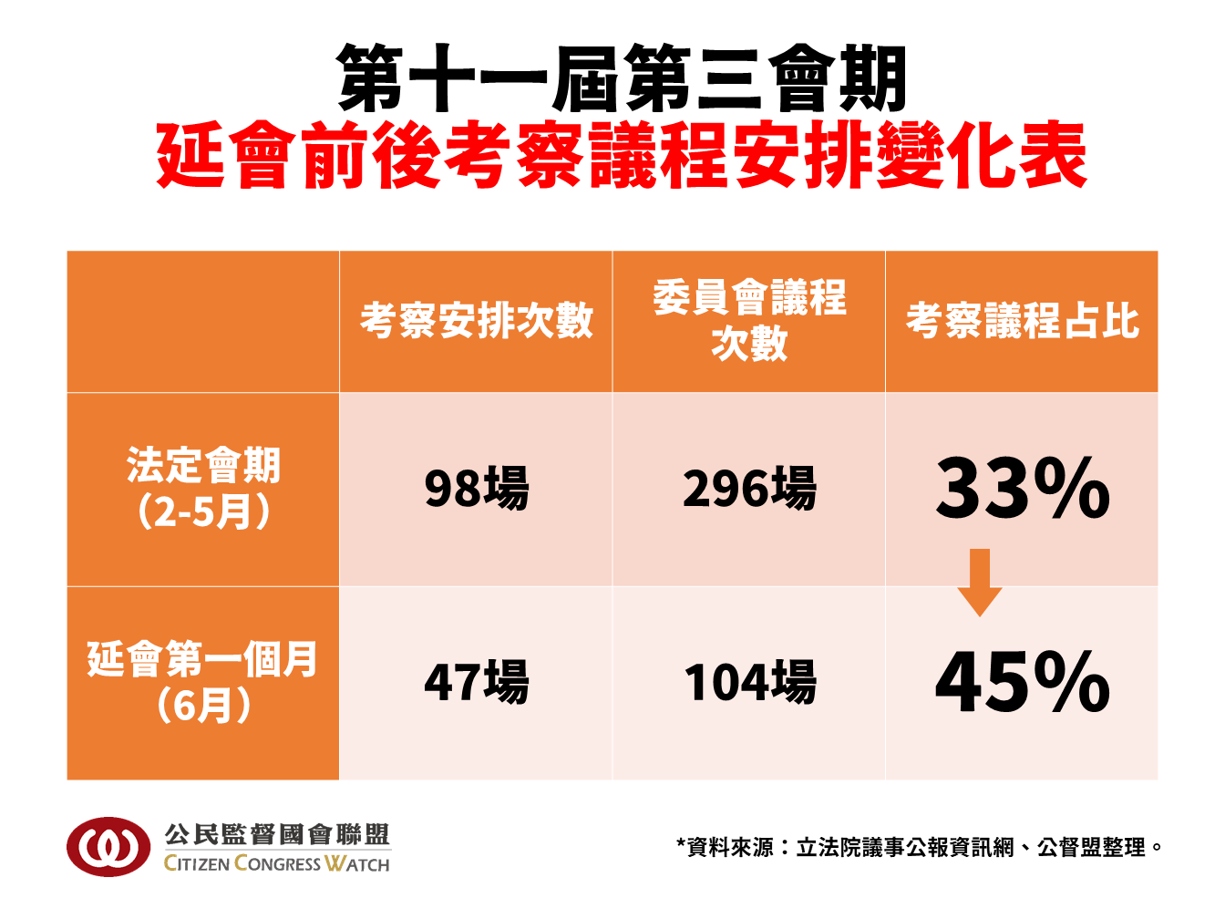 公督盟常務監事林美娜表示:「根據公督盟統計,八個常設委員會,截至六月底有將近2614件待審法律案,但同時各個常設委員會在本會期總共安排將近145場考察,創下第七屆立委席次減半後的新高!更進一步觀察延會前後,考察佔整體委員會議程更是大幅增加,從原先33%增加至45%,甚至連立法院長周萬來都要發文提醒各委員會「國內旅費」需要審慎控管,凸顯出延會根本無心處理重大民生法案!公民應睜大眼睛,監督立委問政表現,拒絕國會怠惰。」