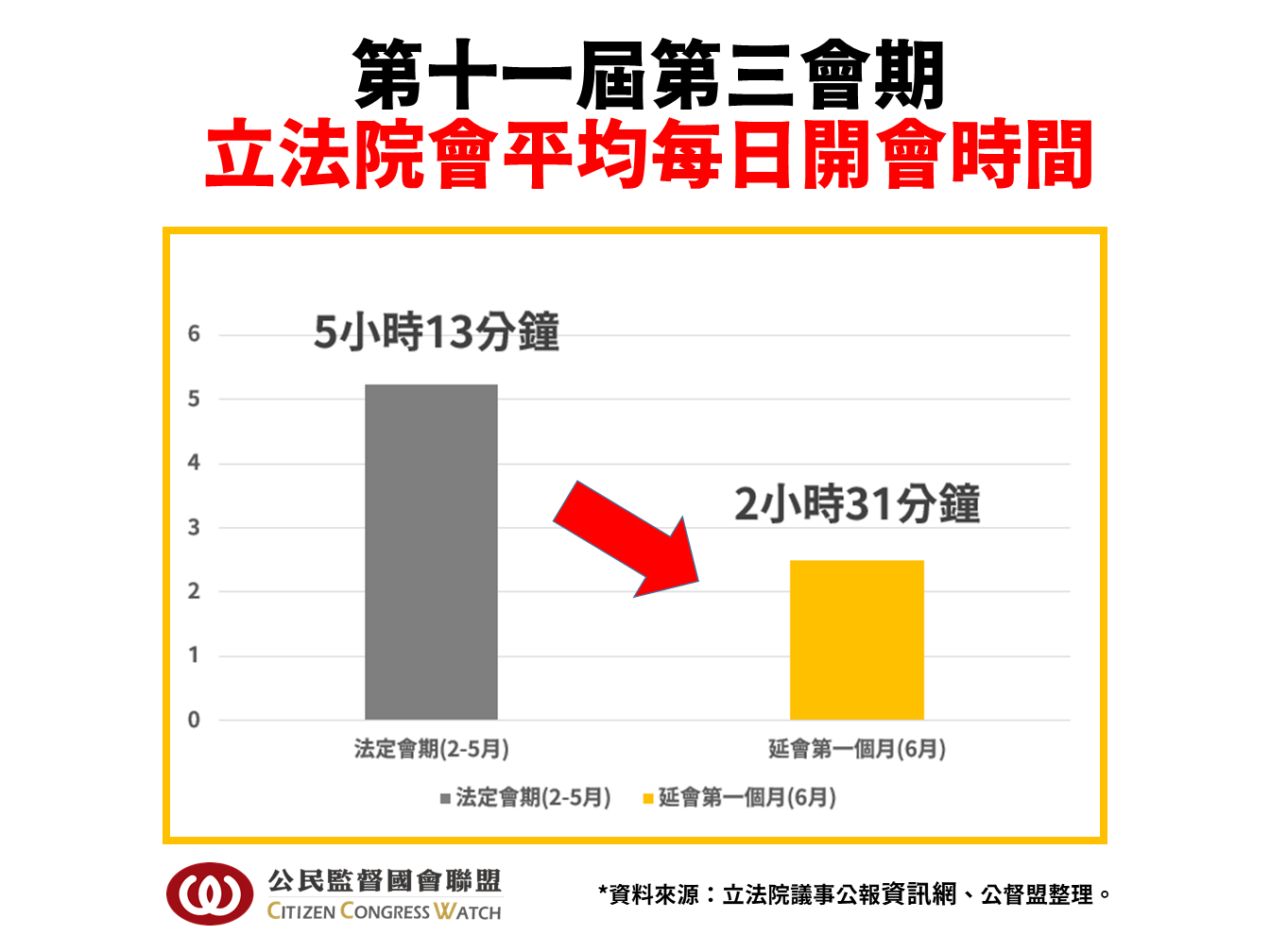 立法院本會期已確定延會到七月底,日前民眾黨更主張加碼延會到八月底,公民監督國會聯盟(公督盟)多次強調延會不能亂延、空延、假延,必須向社會大眾清楚說明延會目的,回顧這一個月的延會,國會不僅安排大量考察行程,院會開會時間大幅縮水,更有許多當初主張延會的國民黨立委不去開會、不去質詢,讓多項重要民生、國安法案審議陷入停滯。
