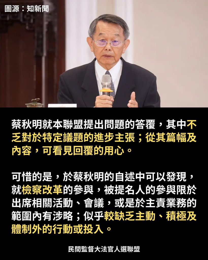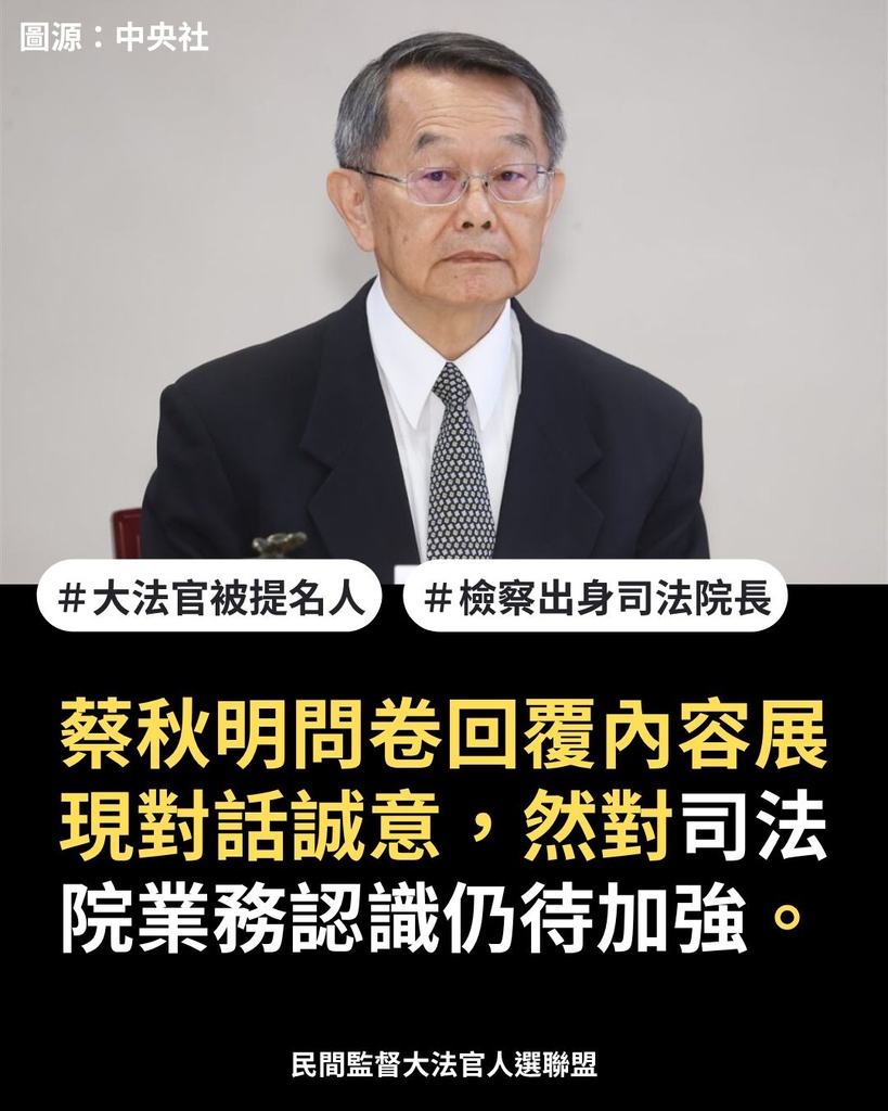 本聯盟認為,司法院長的人選未必要到對整個司法院的一草一木都知之甚詳。然而,本聯盟認為蔡秋明作為院長被提名人,對司法院相關業務的理解程度而言,尚須加強。
