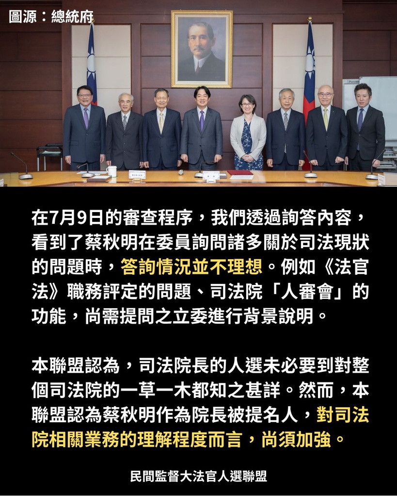 本次被提名人於立法院分別於7月9日、10日、14日完成詢答程序。同時,全部被提名人亦於16日回覆本聯盟問卷,並由本聯盟公開。本聯盟謹慎審視本次詢答程序,以及被提名人回覆問卷情形後,針對院長被提名人部分,聲明如下