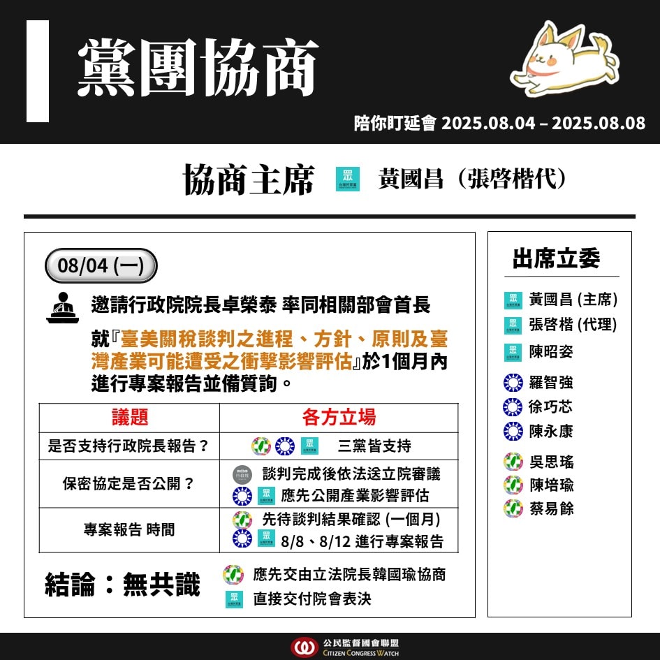 國民黨與民眾黨團則主張,關稅影響重大,應於本週五(8/8)、下週二(8/12)就進行專案報告,並由行政院長自行拿捏保密條款內容。