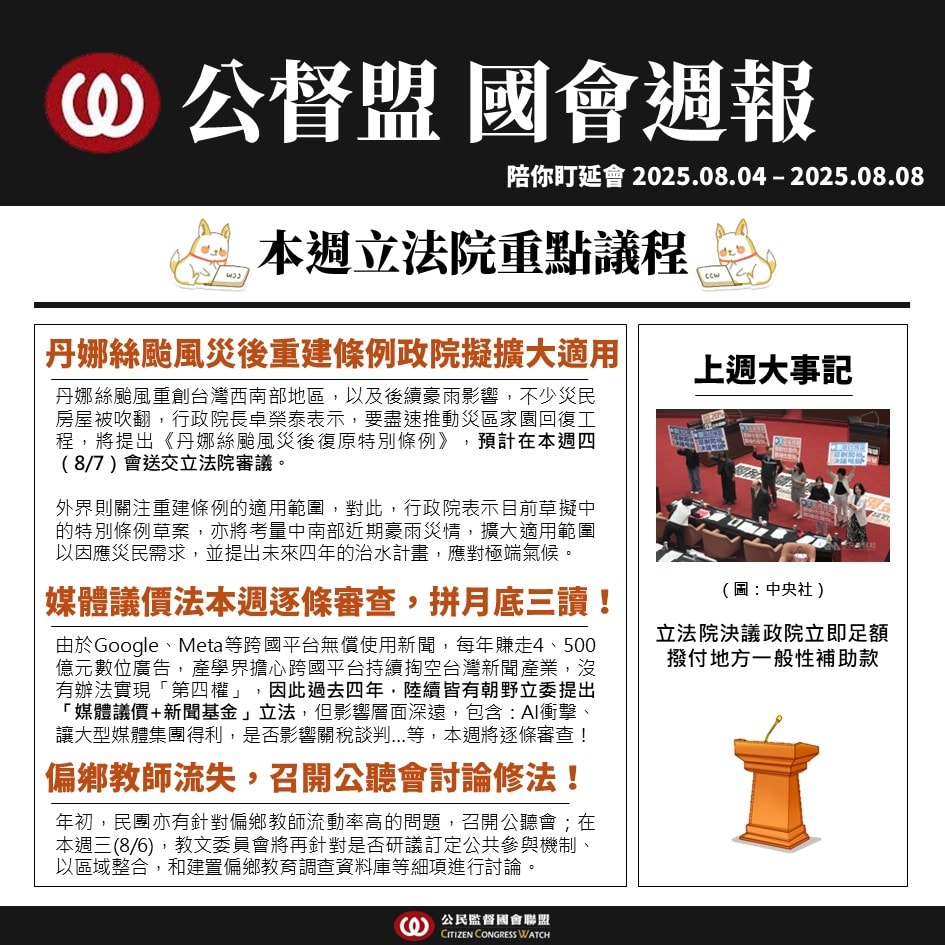 另外,行政院長卓榮泰指示,要盡速推動災區家園回復工程,將提出《丹娜絲颱風災後復原特別條例》,預計在本週四(8/7)會送交立法院審議。