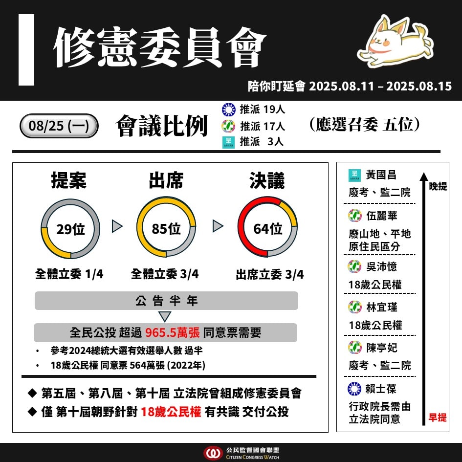 上週五,在朝野無異議之下,通過決議組成修憲委員會,且 依照政黨比例,國民黨團推派19人、民進黨團推派17人、民眾黨團推派3人,並定於25日舉行立法院第11屆修憲委員會第1次全體委員會議 。