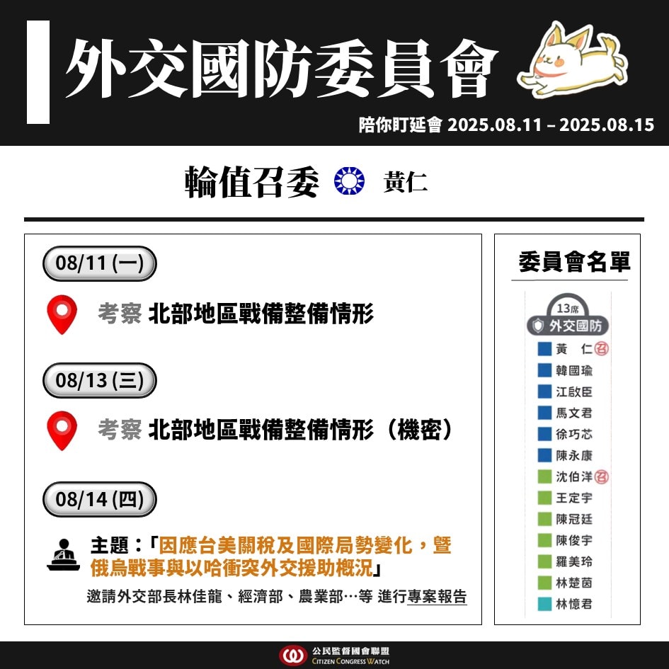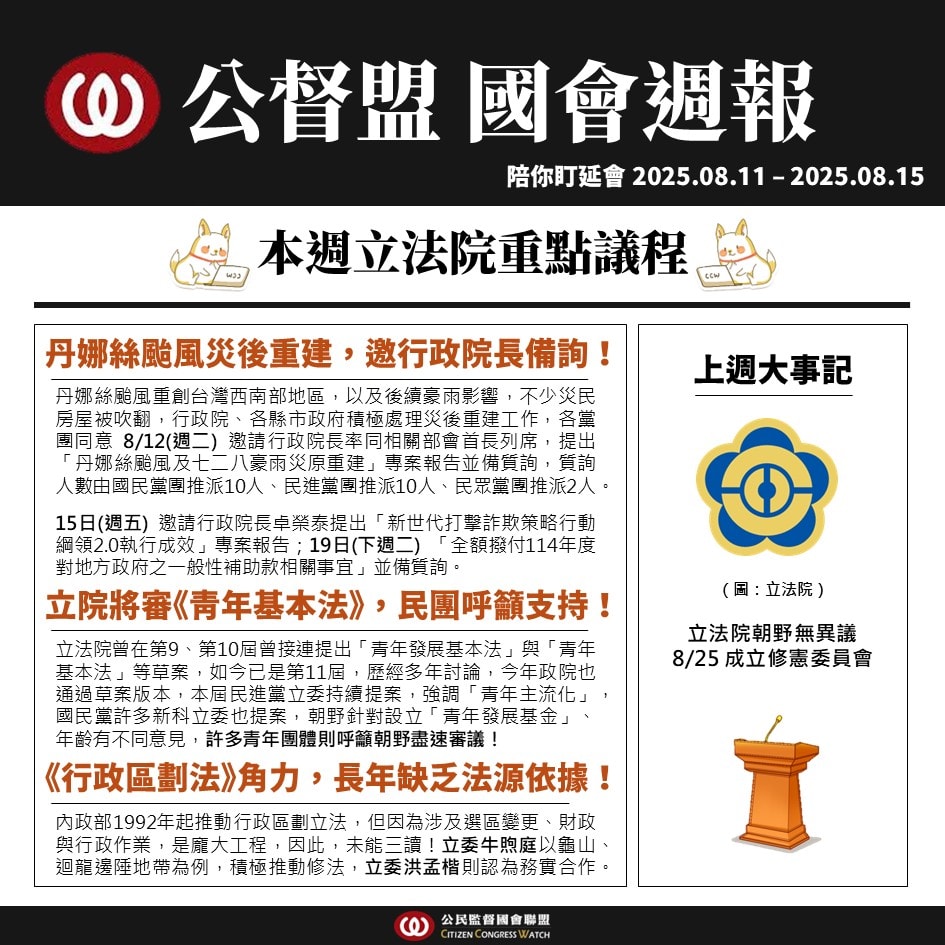 各黨團同意 8/12(週二) 邀請行政院長率同相關部會首長列席,提出「丹娜絲颱風及七二八豪雨災原重建」專案報告並備質詢,質詢人數由國民黨團推派10人、民進黨團推派10人、民眾黨團推派2人。