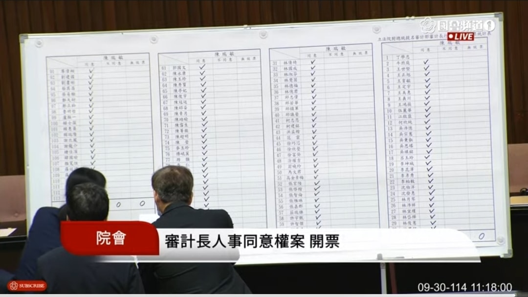 總統賴清德提名現任審計長陳瑞敏續任,並咨請立法院行使人事同意權一事,經本(9)月12日黨團協商確定,於今(30)日上午進行審計長人事同意權案記名投票表決。