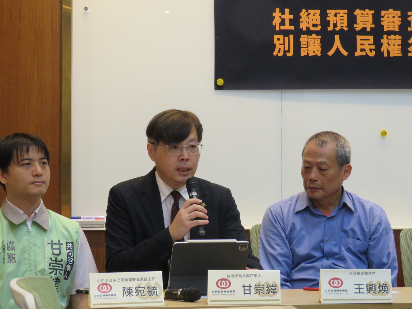 台灣綠黨共同召集人甘崇緯強調,國會不容預算審查亂象,人民的血汗錢不是鬥爭的工具!他提出三點主張:第一,建立預算提案公開制度;第二,遵守委員會中心主義;第三,刪減必須有依據!