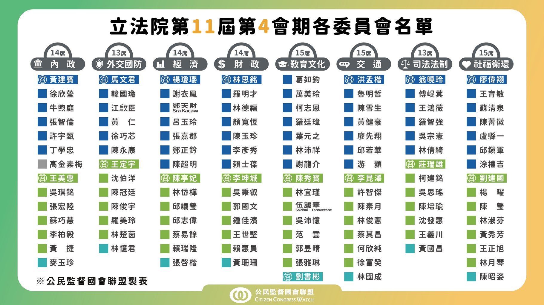 第十一屆第四會期,常設委員會召委、委員名單出爐!
