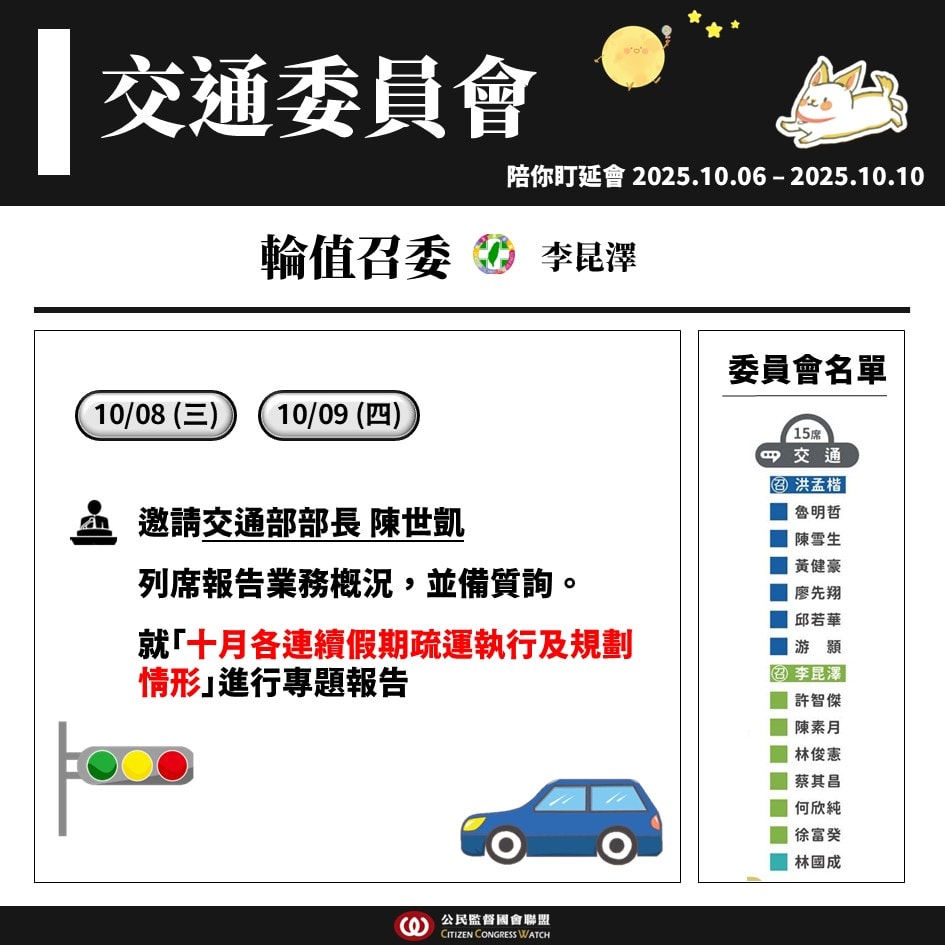 交通委員會本週三(8日)將邀請交通部長陳世凱針對連續假期的交通疏運計畫和執行,進行專案報告!
