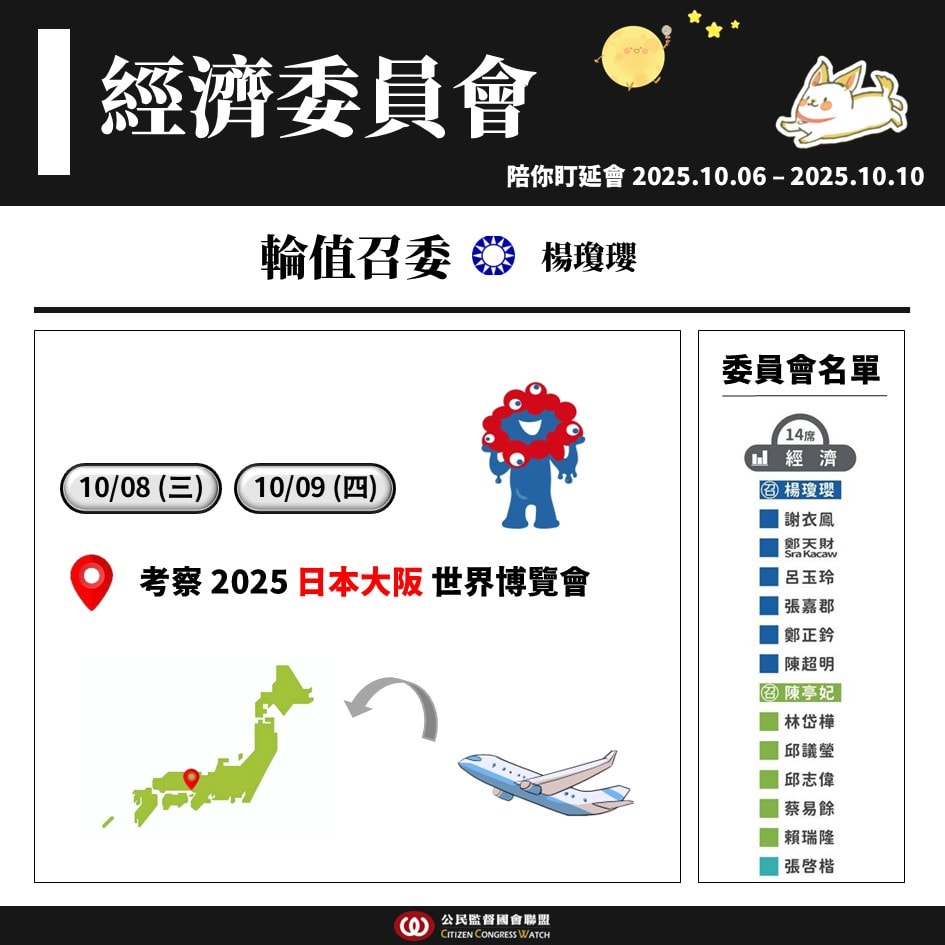 立法院剛開議,經濟委員會召委楊瓊瓔,選在審議韌性特別預算當週,組團赴日本大阪世博考察。