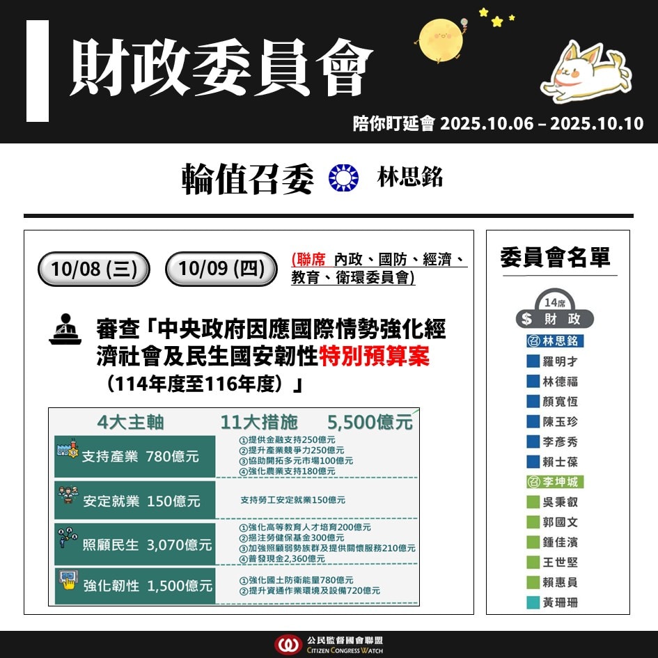 其中,普發現金佔整體特別預算43%,財政委員會將聯席各委員會,在本週三、四進行審查,若韌性特別預算案順利在委員會初審通過,最快可在17日排入立法院會的討論事項,並於當日完成三讀。
