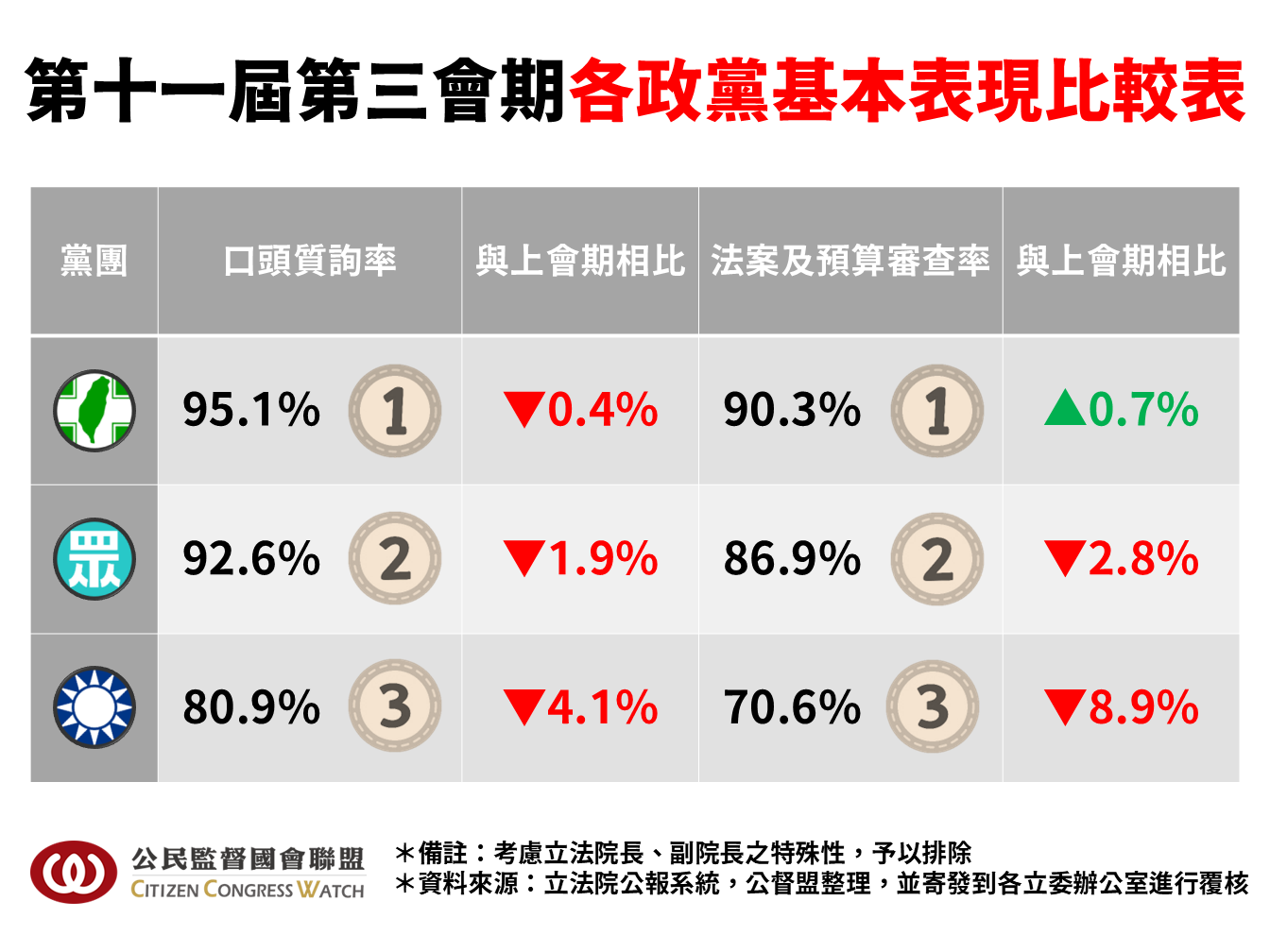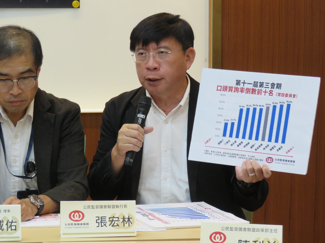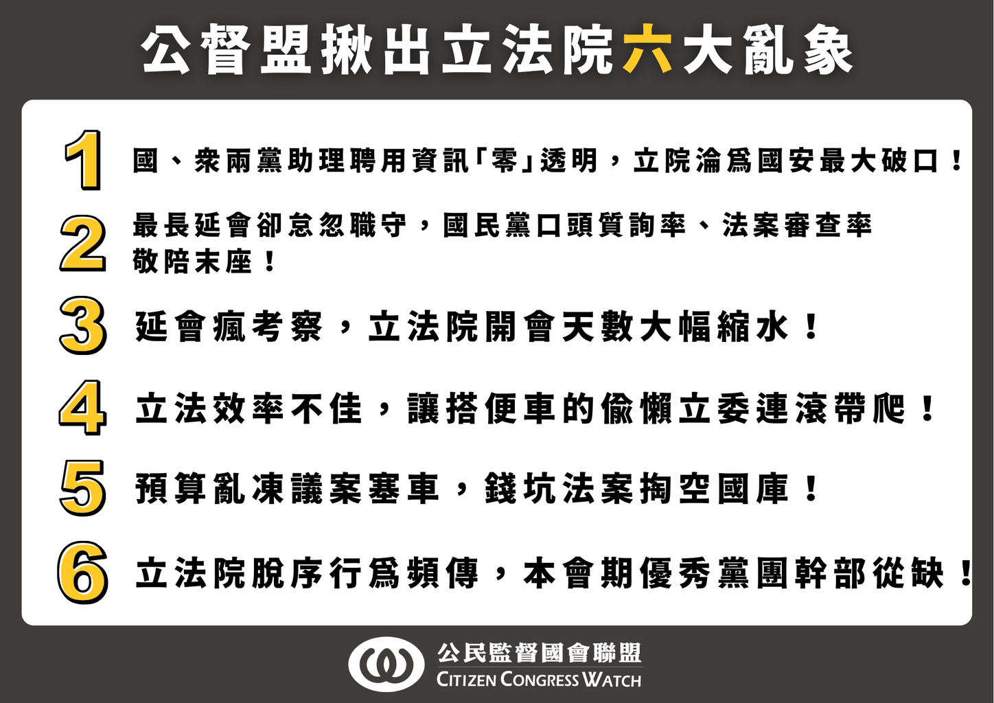 公督盟執行長張宏林表示:「本會期延會近三個月,創下史上最長紀錄!然而回顧這段期間,立法院不僅沒有展現應有的立法效率,反而淪為『假開會、真怠惰』!若細看各政黨的平均口頭質詢率,以及法案及預算審查率,可以發現國民黨的基本問政表現皆是敬陪末座,並且與其他政黨有不小落差,顯然是黨內部分立委疏於問政,自我閹割立法權!公督盟再次強調立法委員身為人民公僕,一個月領超過二十萬的公帑、上千萬補助,開會、質詢本來就是其本分,怠忽職守的立委必將負起政治責任!」