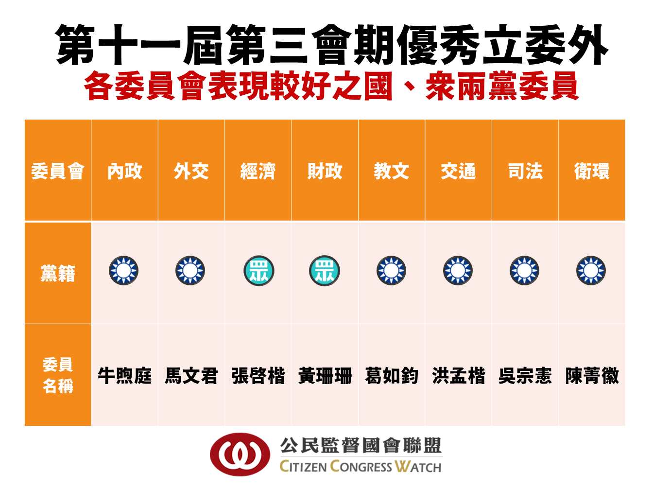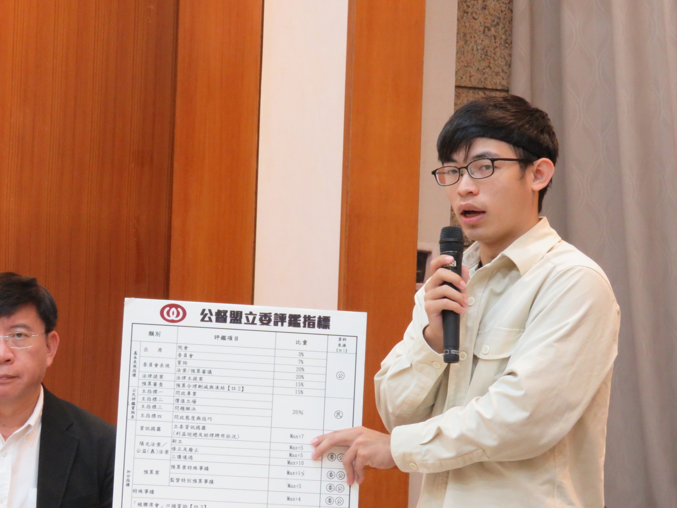 公督盟理事長謝東儒表示:「有別於其他立委評鑑機構,只著墨於法律提案上,公督盟立委評鑑則是依照憲法賦予立委職權所設計的評鑑指標,共有24大項,並可細分為51項指標,並將評鑑報告書主動上網,存放於國家圖書館、國會圖書館等重要機構;資料來源則主要使用立法院公開資料,並且寄發到各委員辦公室進行覆核,進行質量兼具的立委評鑑。同時納入公民評鑑立委質詢的實名機制,導入參與式民主的概念;最後,立委辦公室必須要向全民揭露利益衝突資訊,才有機會獲得公督盟的優秀立委,很遺憾國民黨、民眾黨本會期並未向社會大眾揭露公費助理聘用、立委兼職…等資訊,明顯有違公督盟「優秀立委」應具備的陽光透明原則,因此本會期國民黨、民眾黨兩黨無人獲獎!」