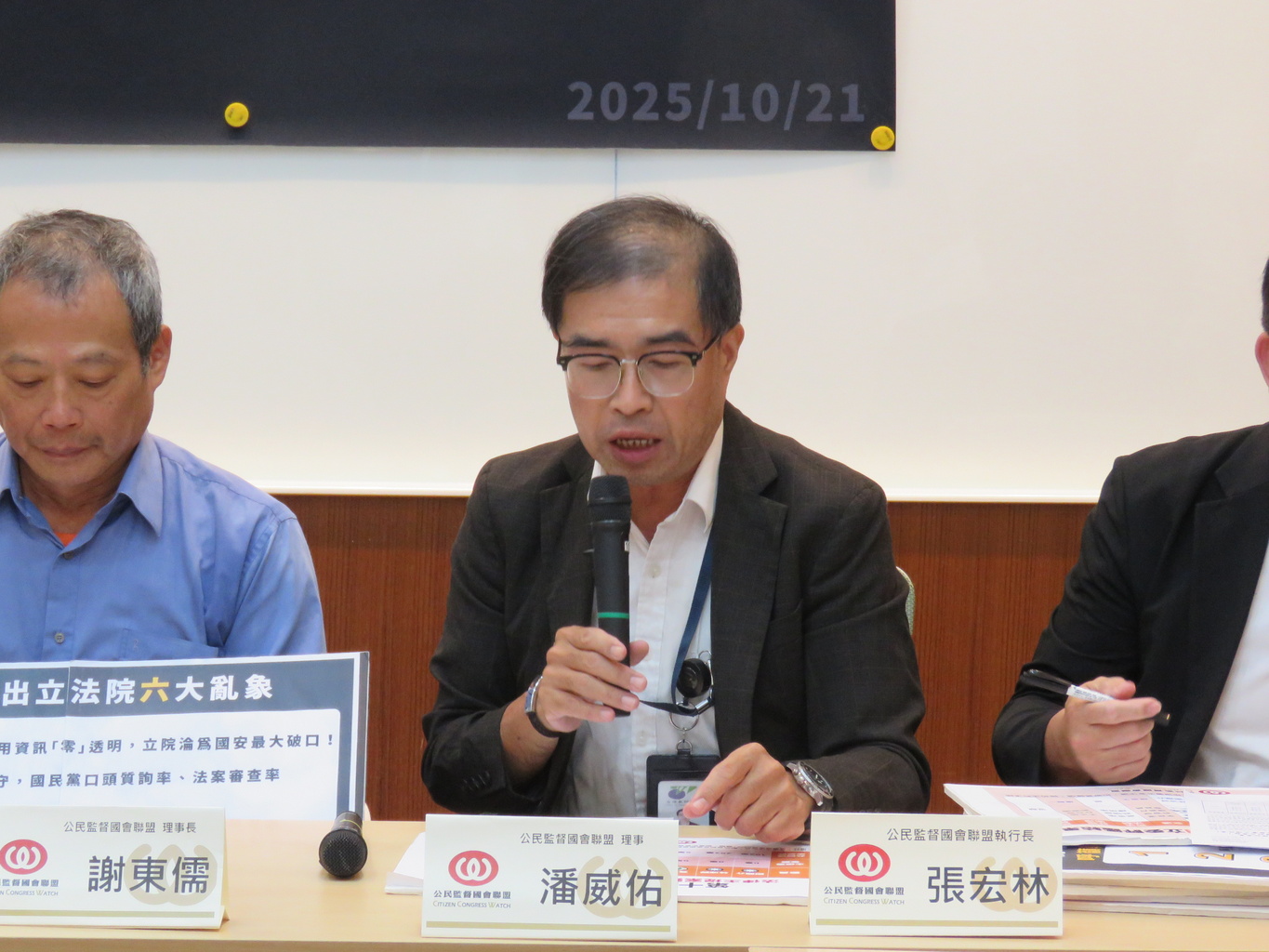 公督盟常務理事曾建元強調:「在這段期間,立法委員有關利益衝突案件不斷登上新聞版面,包含:國會助理向廠商索賄、立委兼職當門神,以及涉嫌詐領助理費…等等,甚至在本會期,立院朝野各黨的前助理都被爆出涉嫌共諜案中,凸顯出立法院在國安管理上的巨大漏洞,作為機敏資料流通的核心機構,卻對於上千名國會助理缺乏管理,顯然因為立委利益衝突資訊長期黑箱,讓特定有心人士可以濫用助理的身分,肆無忌憚進行索資、施壓,可謂對台灣民主一大傷害!」