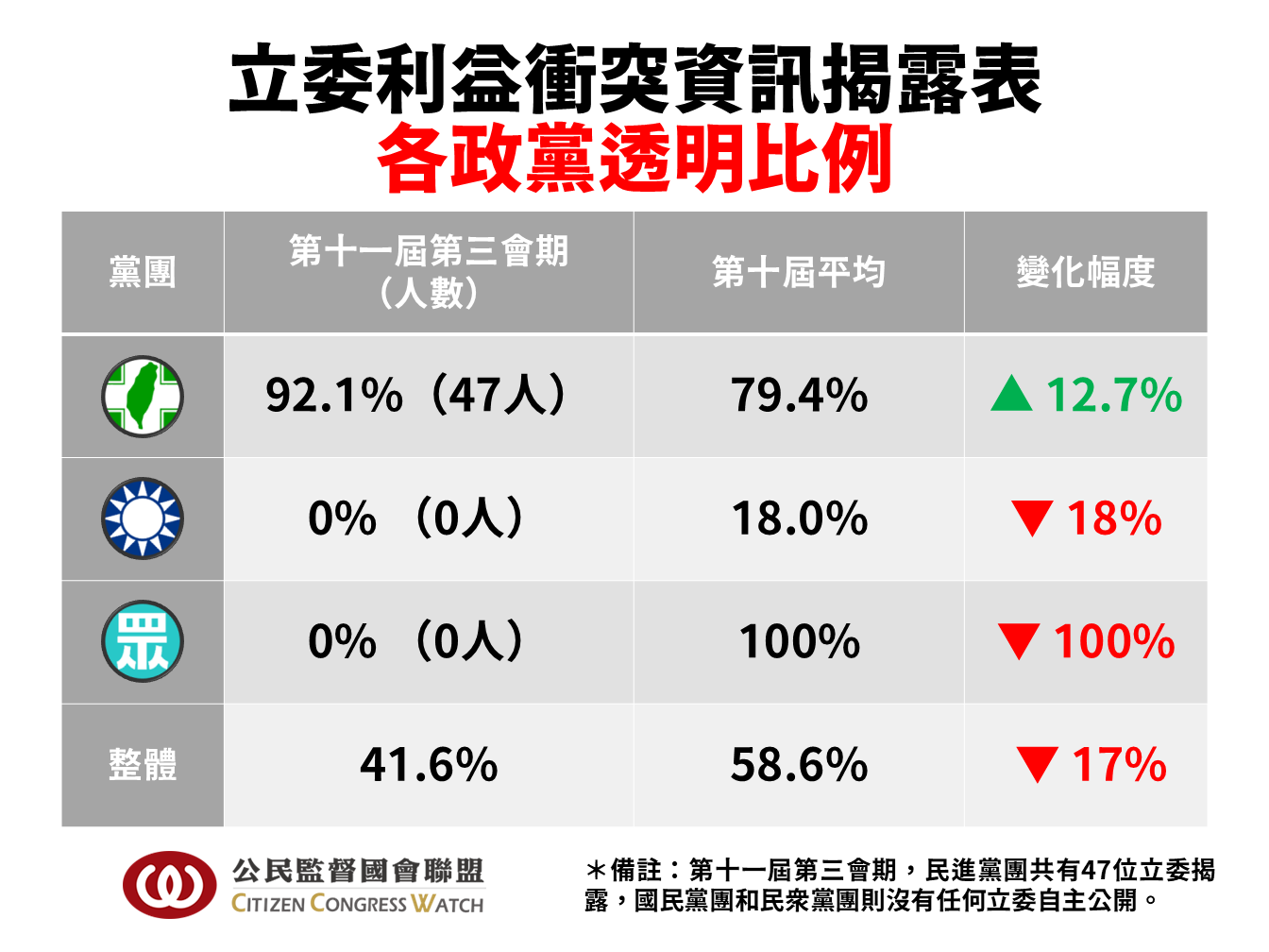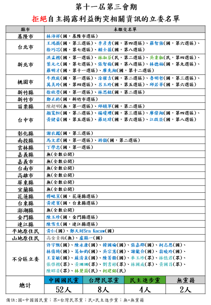 公督盟更要再次呼籲國民黨團、民眾黨團,身為人民的公僕,就應有責任自主公開公費助理聘用資訊,向選民做負責!而不是禁止黨籍立委將這些重要的資訊進行自主揭露,破壞台灣的民主發展!