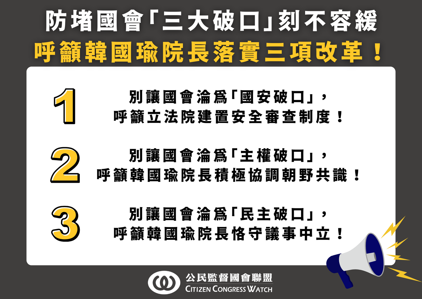 防堵國會「三大破口」刻不容緩 呼籲韓國瑜院長落實三項改革!
