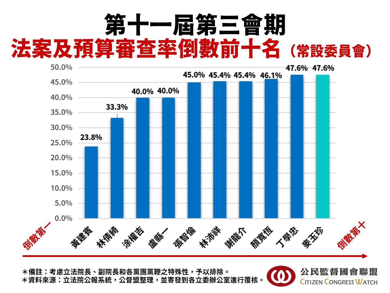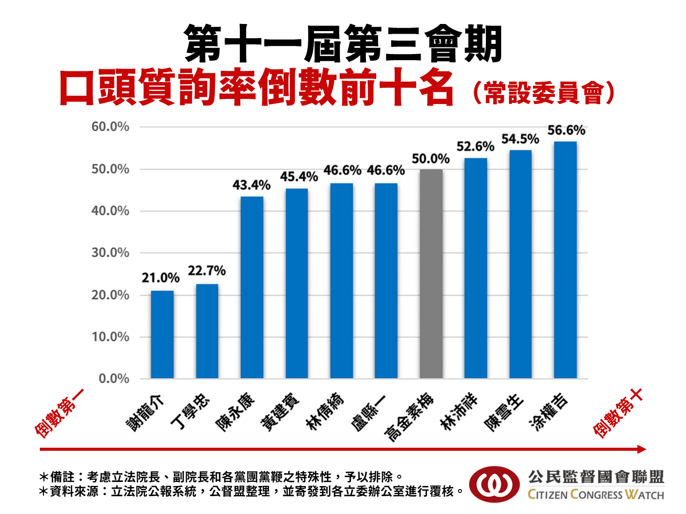 值得注意的是,除了不質詢,有些立委在法案與預算審查的參與度亦同樣偏低。謝龍介、丁學忠、黃健賓、盧縣一、林倩綺、林沛祥、涂權吉等委員皆同時出現在口頭質詢與審查參與的倒數名單中,呈現出對委員會議事參與上的低落。不禁令人質疑立法委員每年領有超過千萬的納稅人公帑,卻棄守立委職責,對此,恐對於選民、國人都難以交代!