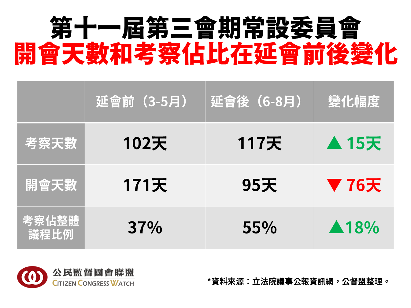 根據立法院議事公報資訊網,延會前後皆為三個月,但開會天數和考察佔比卻有明顯變化,首先,開會天數直接一口氣少了76天,部分召委在延會期間不排案,或安排大量考察行程,導致許多重要民生法案無法進一步取得進展,其次,為了救罷免選情,各委員會出現許多與災情、議案完全無關的考察行程,讓其淪為旅遊、綁樁行程,公督盟呼籲立院應將考察成果公開,別浪費人民辛苦的納稅錢!