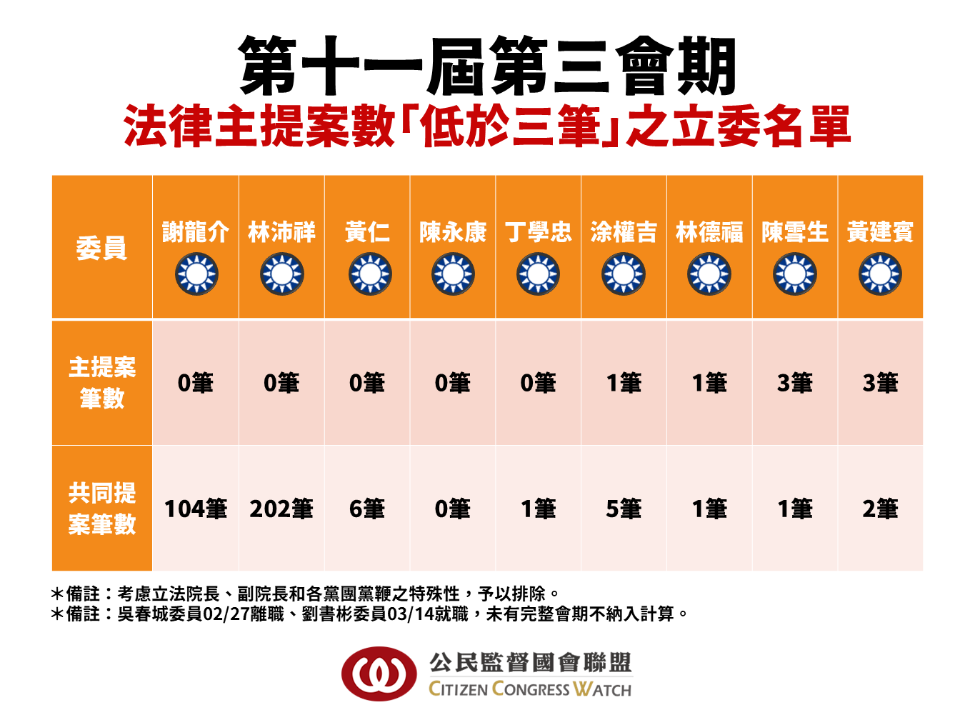 公督盟不鼓勵立委浮濫提案,因此,在評鑑過程當中亦會針對每一筆提案單進行檢視,將不同法同目的,以及同法同目的予以併案,反映真實提案狀況,不過在本會期卻有五位立委,在開會六個月的情況下,連一筆提案都未提出,分別是謝龍介、林沛祥、陳永康、丁學忠,和黃仁,令人好奇這些立法委員月領超過二十萬的公帑,是否有好好行使憲法所賦予的職權,其中特別是國民黨籍林沛祥、謝龍介委員在本會期主提案掛零,但共同提案卻分別高達202、104筆,如此的搭便車(free rider)現象更是前所未見,恐讓政治責任難以釐清,讓原先共同提案的美意淪為政治人物偷懶的藉口!