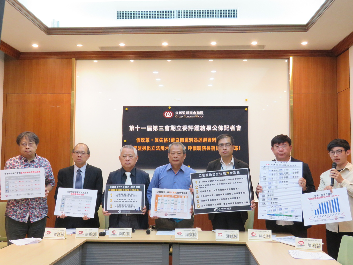 公督盟理事長謝東儒補充:「本會期創下史上最長延會,但是綜觀整體國會問政表現卻依舊低迷,許多委員會安排大量和災情、議案無關的考察,跑地方綁樁救罷免,讓原本可以從從容容的立法進度,搞成匆匆忙忙,連滾帶爬,不僅許多重要民生法案進度卡關,今年度的國營事業預算準備拖到十一月才要協商,讓整體國政陷入停滯,對民主國家而言,要先有正常國會,才有正常國家!因此,公督盟點出本會期立法院六大亂象,並且鄭重呼籲韓國瑜院長作為立法院的領導者應盡速落實三項改革!」