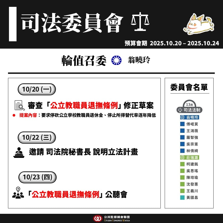 本週司法法制委員會召委翁曉玲,安排審查「公立學校教職員退休資遣撫邮條例」,要求停砍退休教師年金,捍衛軍公教尊嚴!