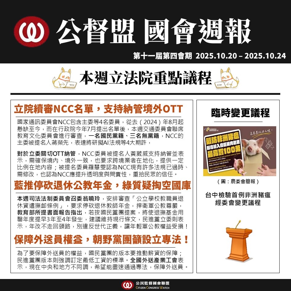 ■公督盟國會週報—第十一屆第四會期(預算會期)