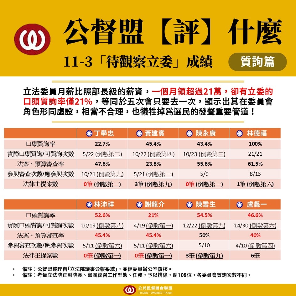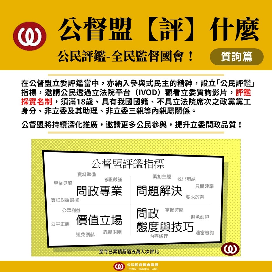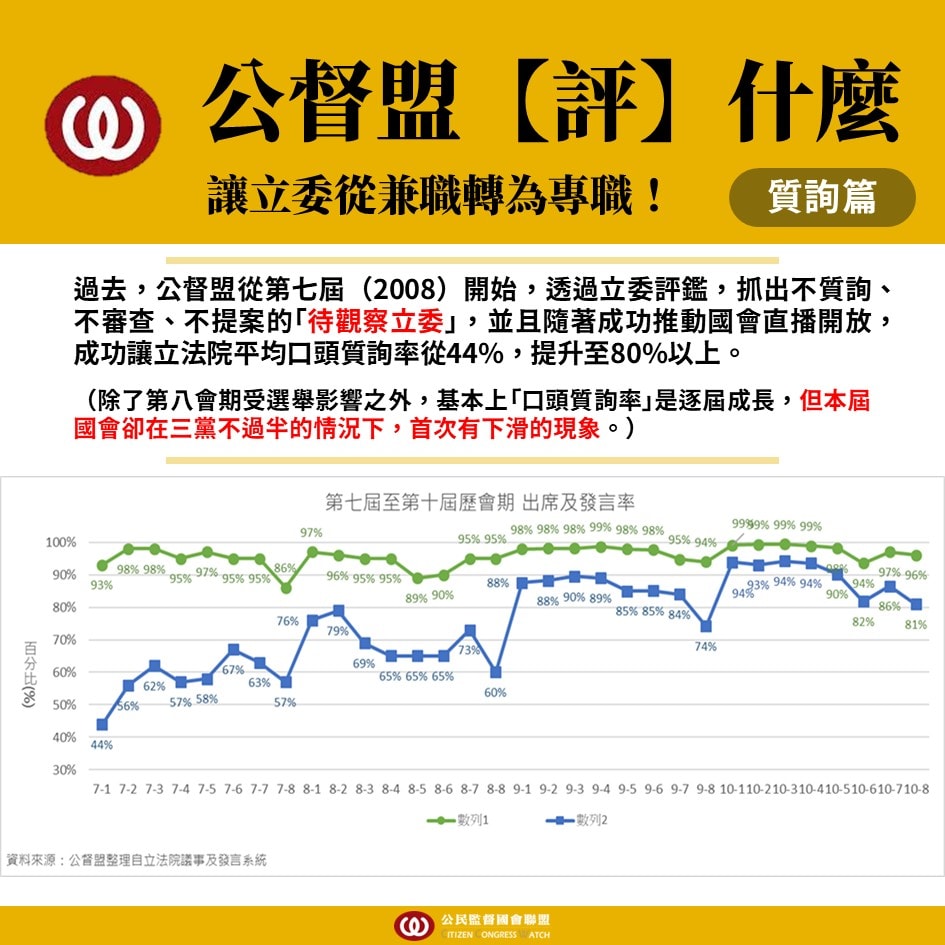 過去,公督盟從第七屆(2008)開始,透過,立委評鑑,抓出不質詢、不審查、不提案的「待觀察立委」,隨著推動國會直播開放,成功讓立法院平均口頭質詢率從44%,提升至80%以上。