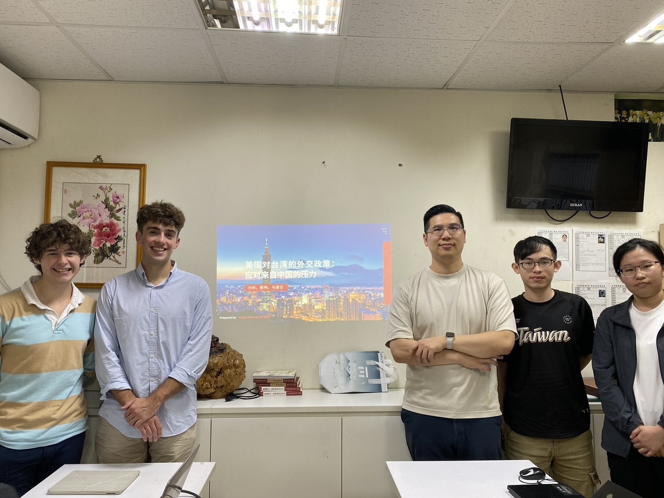 來自美國的大學生 Matthew 與Rupert,在期末分享中分析了美中台三邊關係的變化、台美國會交流與立場差異、以及美國政治極化的現象與政治人物角色的影響力。