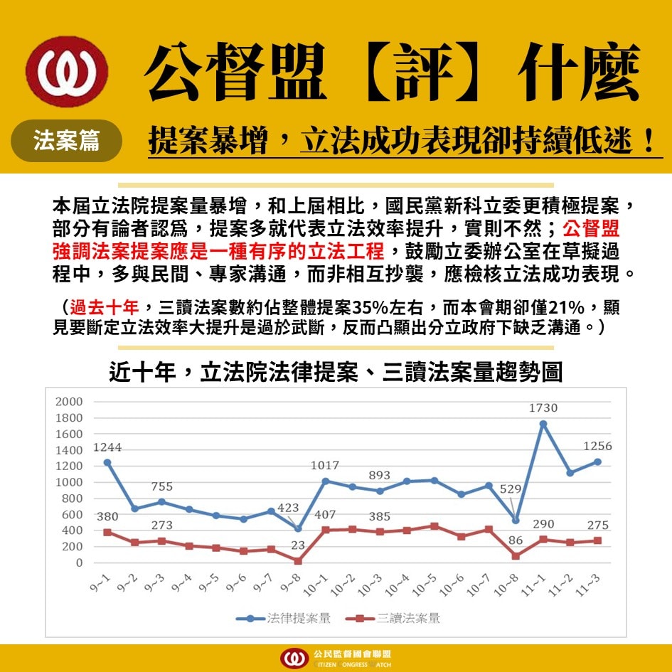 本屆立法院提案量暴增(11-3共有1256件提案進入一讀),反映國會多數黨輪替…等因素,促使國民黨部分新科立委積極提案,在其他立委評鑑單位中,認為提案多就代表立法效率提升,實則不然。