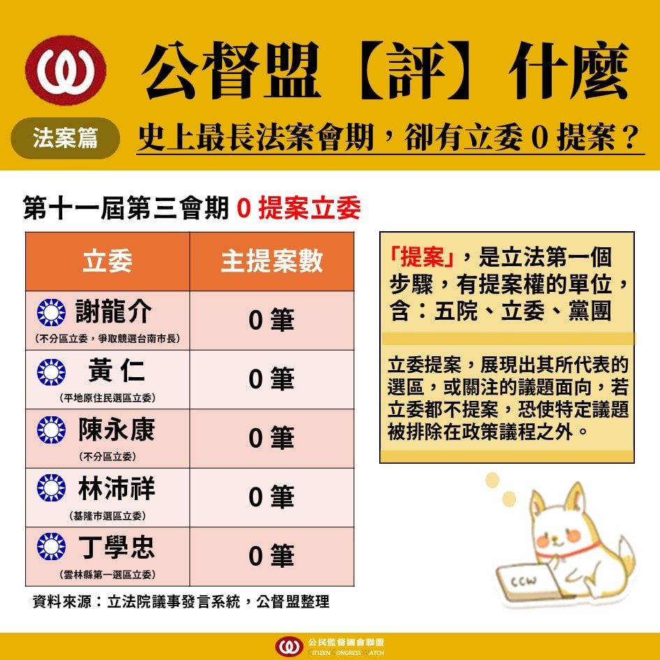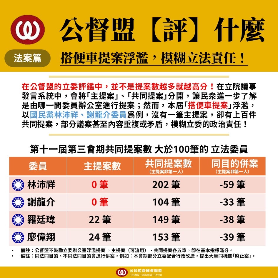 其中,不乏有「區域立委」上榜,公督盟強調,憲法賦予立法委員透過法律案、預算案來監督行政部門,促進社會進步,而立委一年領取上千萬補助,更應回歸本業,立委若完全不提案,等於讓選民的聲音、社會議題消失於國會。