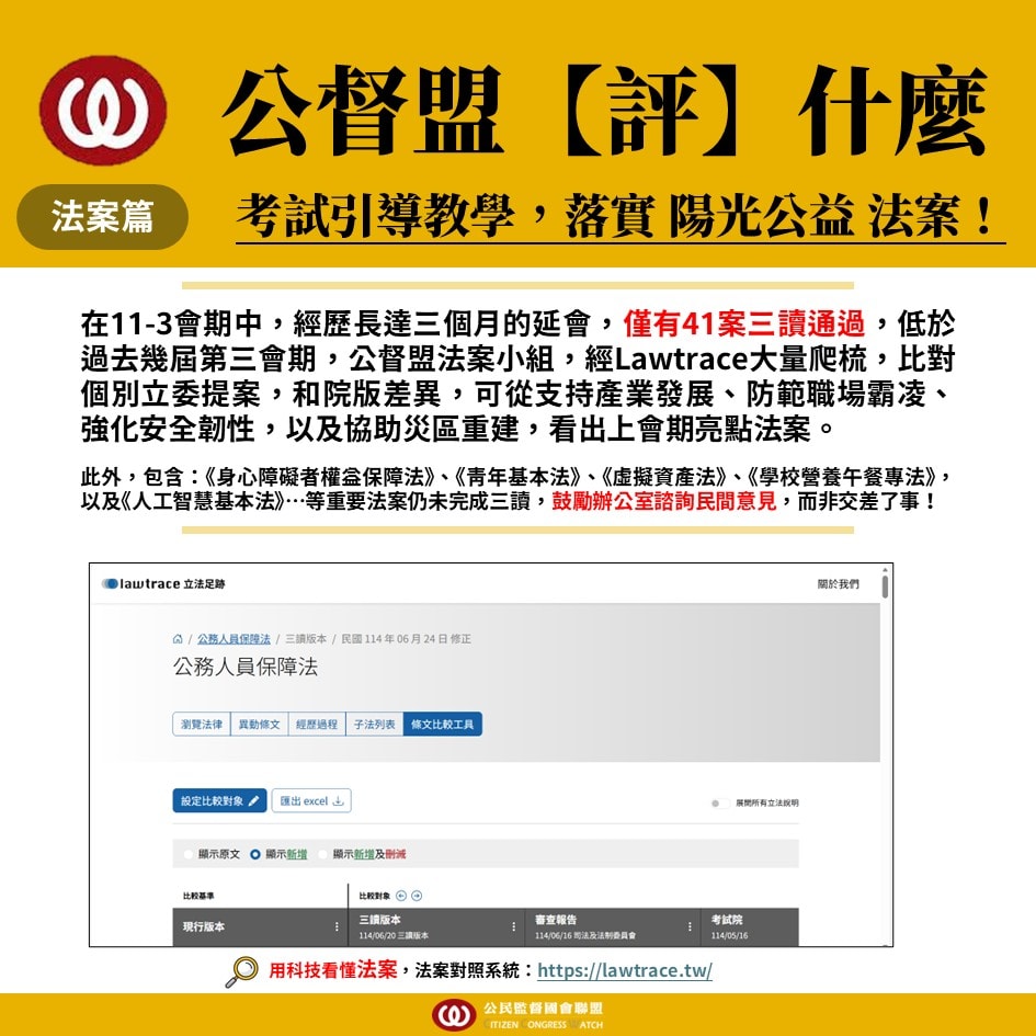 公督盟也鼓勵更多公民利用「LawTrace」提案法律對照系統,尋找您所關心的社會議題,顏色標記版本差異,幫助民眾可以一目了然地掌握法案修正重點。