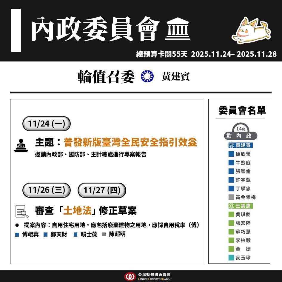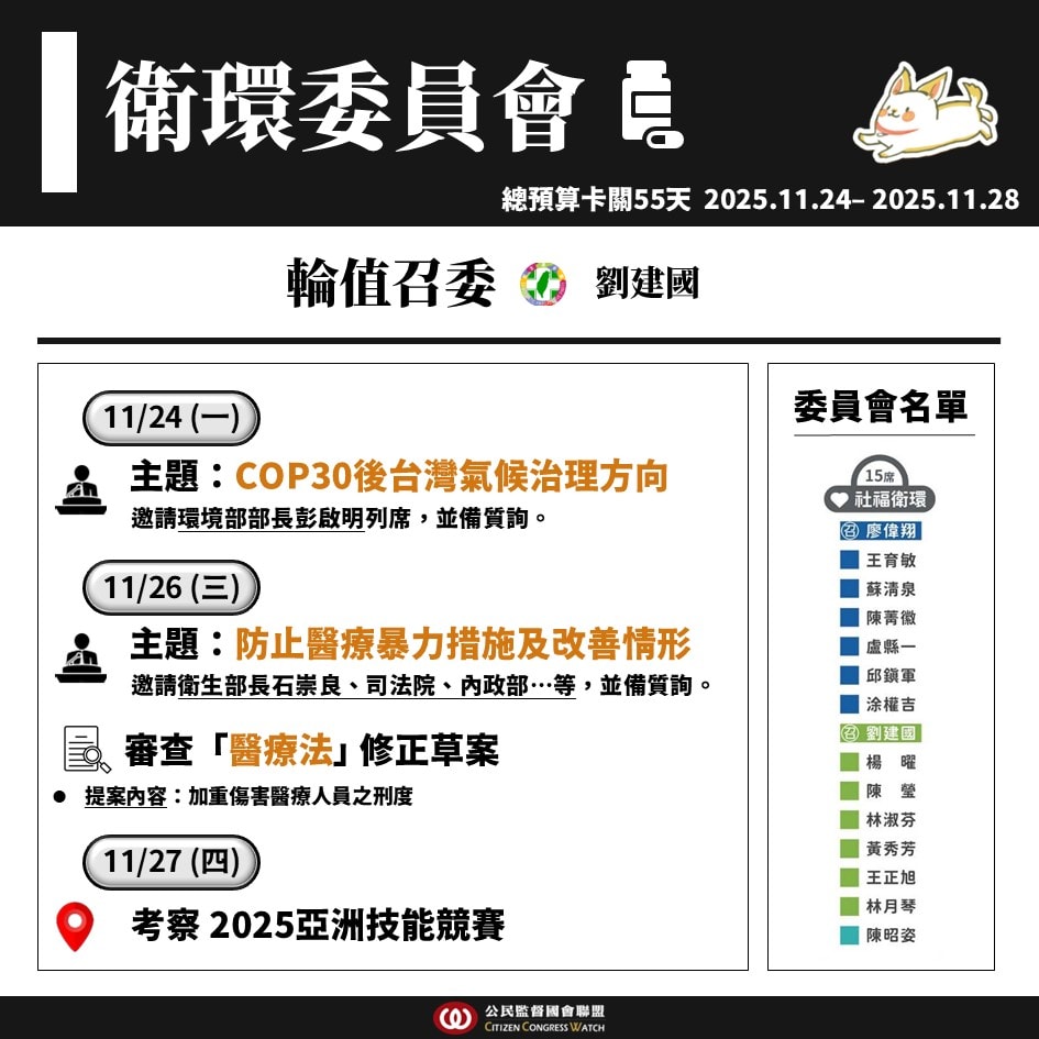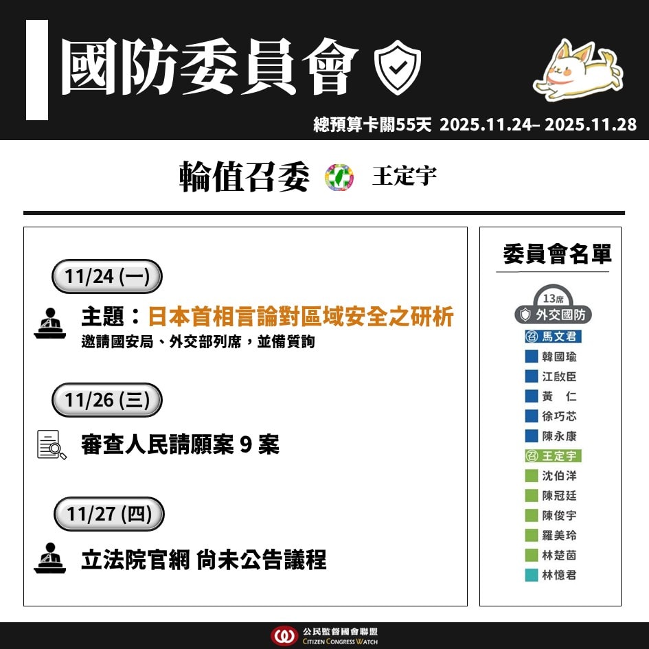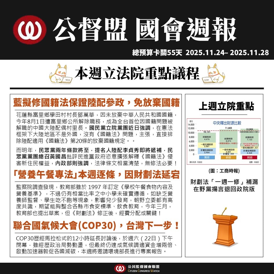 【國會週報】11/24–11/28立法院議程