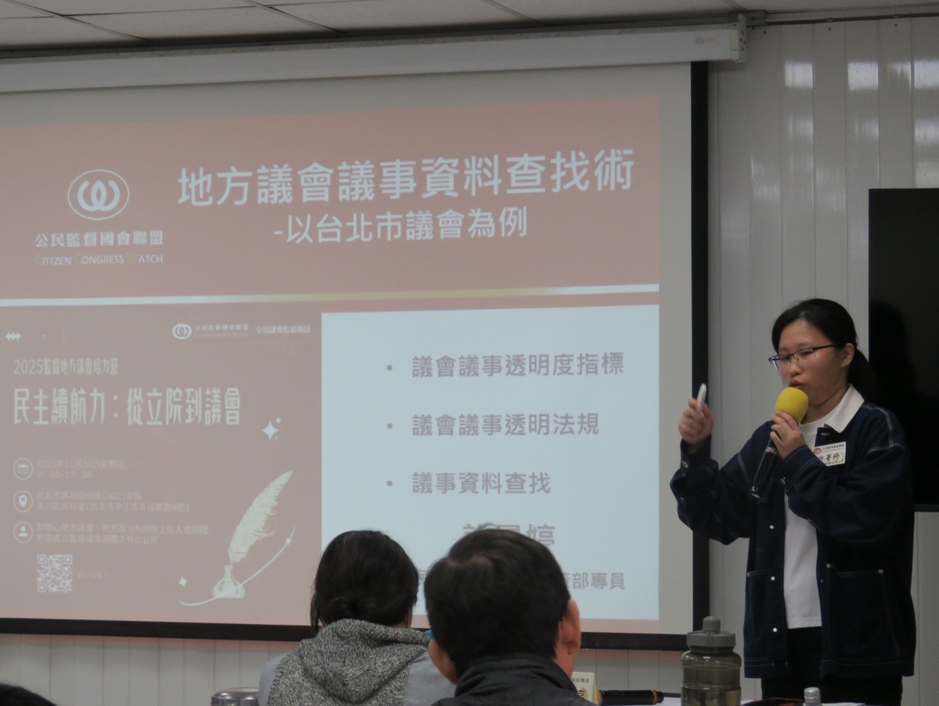 公督盟政策部專員許晏婷,依序從「議會議事透明度指標」、「議會議事透明法規」到「議會議事資料的查找」循序鋪陳,協助公民建立完整的監督工具箱。課程中,分享2024全國議會透明度調查的心路歷程,說明28項指標如何從會前議程公告、會中旁聽與直播,到會後會議紀錄與逐字稿公開,全面檢視各縣市議會的透明程度。她強調,《地方立法機關組織準則》第25條是推動地方議會資訊公開的核心法源。在實作中,她以台北市議會為示範,實際教學如何透過內政部「地方議事透明專區」及各議會官網,查詢會議前、中、後的議事資料,並分組練習比對各縣市現況。公督盟期盼,透過從指標到法規再到實作的培力設計,讓更多公民學會「打開議會大門」,推動地方政治走向透明、負責與可監督的民主治理。