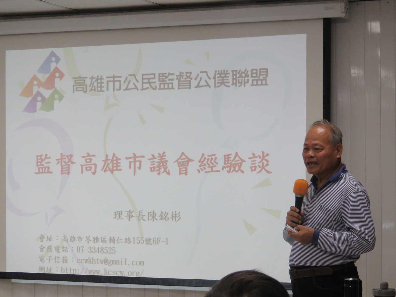 高雄市公民監督公僕聯盟(高督盟)理事長陳銘彬,分享在高雄市議會的監督經驗,他指出,高督盟多年來透過細緻蒐集資料、持續推動議員評鑑,成功促使議員在編列預算時主動刪減議會預算,也讓更多議員願意全程留在議會參與審查。他也強調:「高督盟對每件事都十分謹慎,討論不只是讓自己進步,也能讓整個團體一起成長。若只有一個人衝得太快,反而不是好事。我始終相信,把一件簡單的事用心做好,你就是贏家。」