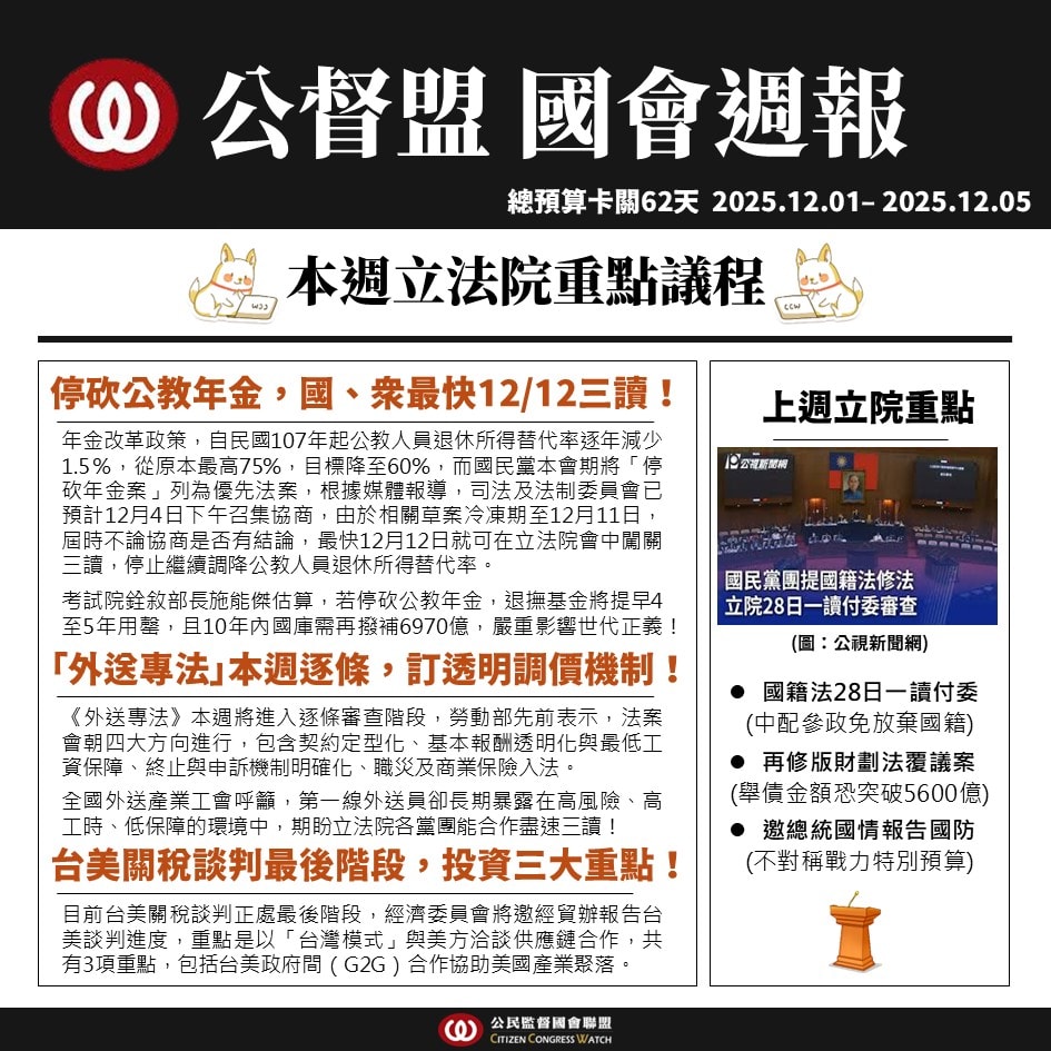 💸 停砍公教年金 國、眾兩黨拚12月12日三讀